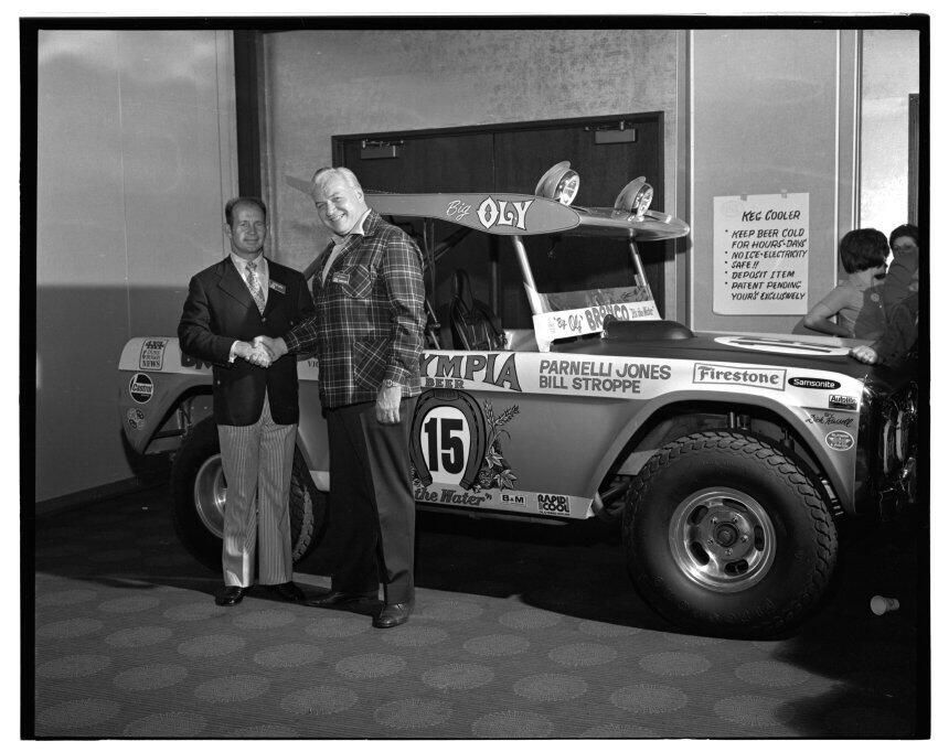Negative, sheet film. 2 x 3 b&w. 72.131. Olympia brewery sponsored "Big Oly" race car (in races like Baja 500) driven by Parnelli Jones and Bill Stroppe. Jones is man in dark jacket and striped pants. No ID on others. Unknown location.Name/Title
