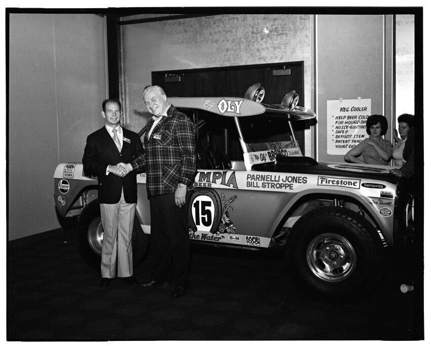 Negative, sheet film. 2 x 3 b&w. 72.131. Olympia brewery sponsored "Big Oly" race car (in races like Baja 500) driven by Parnelli Jones and Bill Stroppe. Jones is man in dark jacket and striped pants. No ID on others. Unknown location.Name/Title