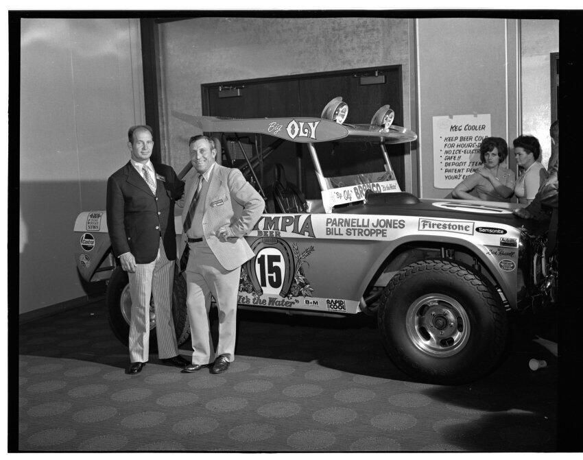 Negative, sheet film. 2 x 3 b&w. 72.131. Olympia brewery sponsored "Big Oly" race car (in races like Baja 500) driven by Parnelli Jones and Bill Stroppe. Jones is man in dark jacket and striped pants. No ID on others. Unknown location.Name/Title