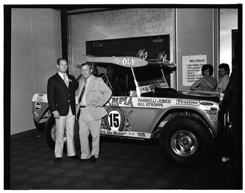 Negative, sheet film. 2 x 3 b&w. 72.131. Olympia brewery sponsored "Big Oly" race car (in races like Baja 500) driven by Parnelli Jones and Bill Stroppe. Jones is man in dark jacket and striped pants. No ID on others. Unknown location.Name/Title