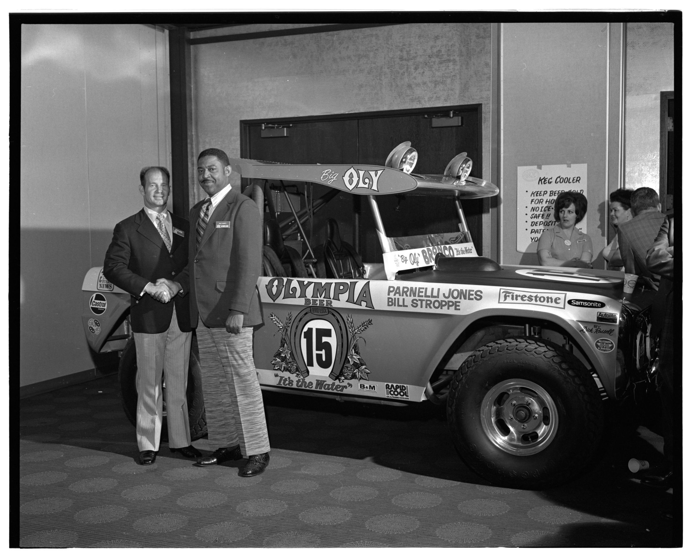 Negative, sheet film. 2 x 3 b&w. 72.131. Olympia brewery sponsored "Big Oly" race car (in races like Baja 500) driven by Parnelli Jones and Bill Stroppe. Jones is man in dark jacket and striped pants. No ID on others. Unknown location.Name/Title