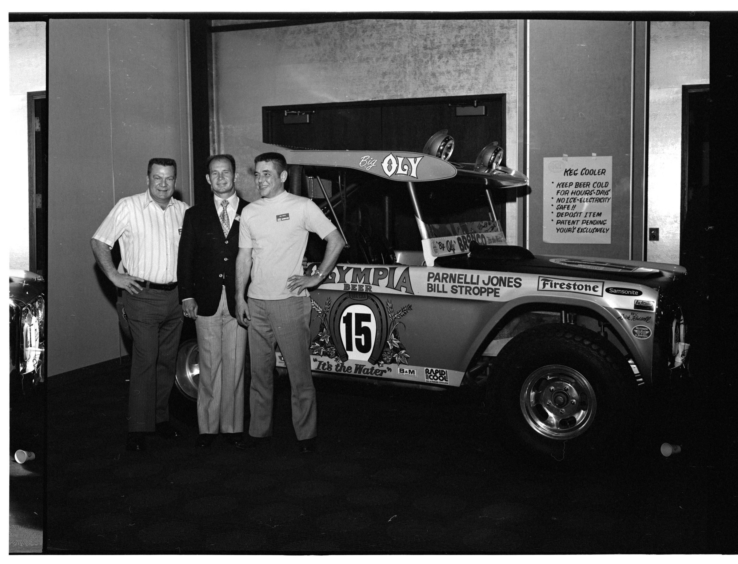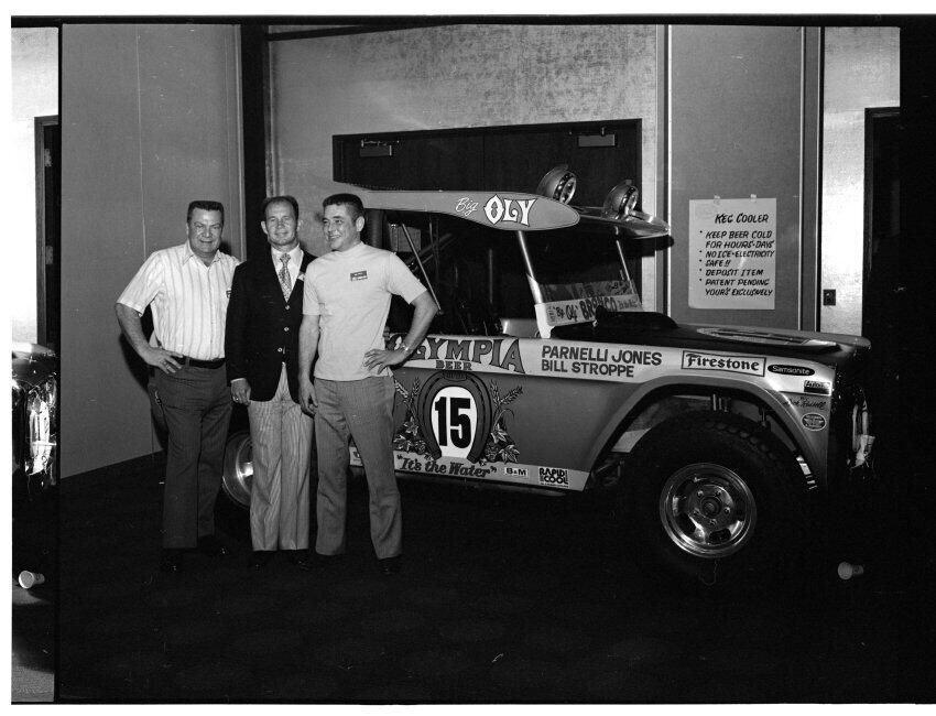 Negative, sheet film. 2 x 3 b&w. 72.131. Olympia brewery sponsored "Big Oly" race car (in races like Baja 500) driven by Parnelli Jones and Bill Stroppe. Jones is man in dark jacket and striped pants. No ID on others. Unknown location.Name/Title