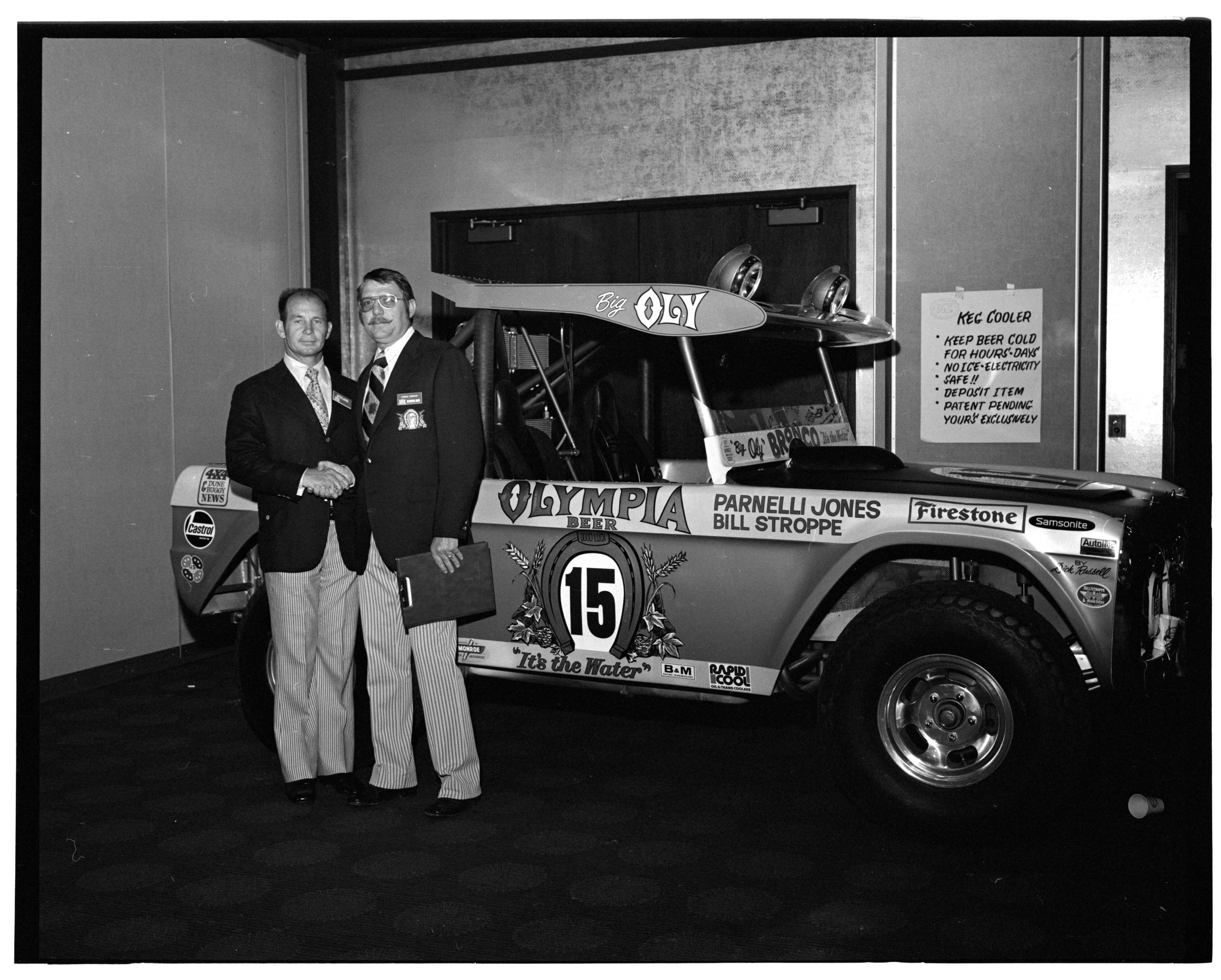 Negative, sheet film. 2 x 3 b&w. 72.131. Olympia brewery sponsored "Big Oly" race car (in races like Baja 500) driven by Parnelli Jones and Bill Stroppe. Jones is man in dark jacket and striped pants. No ID on others. Unknown location.Name/Title
