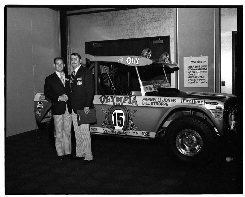 Negative, sheet film. 2 x 3 b&w. 72.131. Olympia brewery sponsored "Big Oly" race car (in races like Baja 500) driven by Parnelli Jones and Bill Stroppe. Jones is man in dark jacket and striped pants. No ID on others. Unknown location.Name/Title