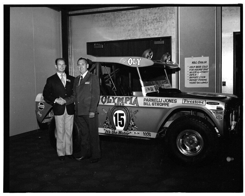 Negative, sheet film. 2 x 3 b&w. 72.131. Olympia brewery sponsored "Big Oly" race car (in races like Baja 500) driven by Parnelli Jones and Bill Stroppe. Jones is man in dark jacket and striped pants. No ID on others. Unknown location.Name/Title
