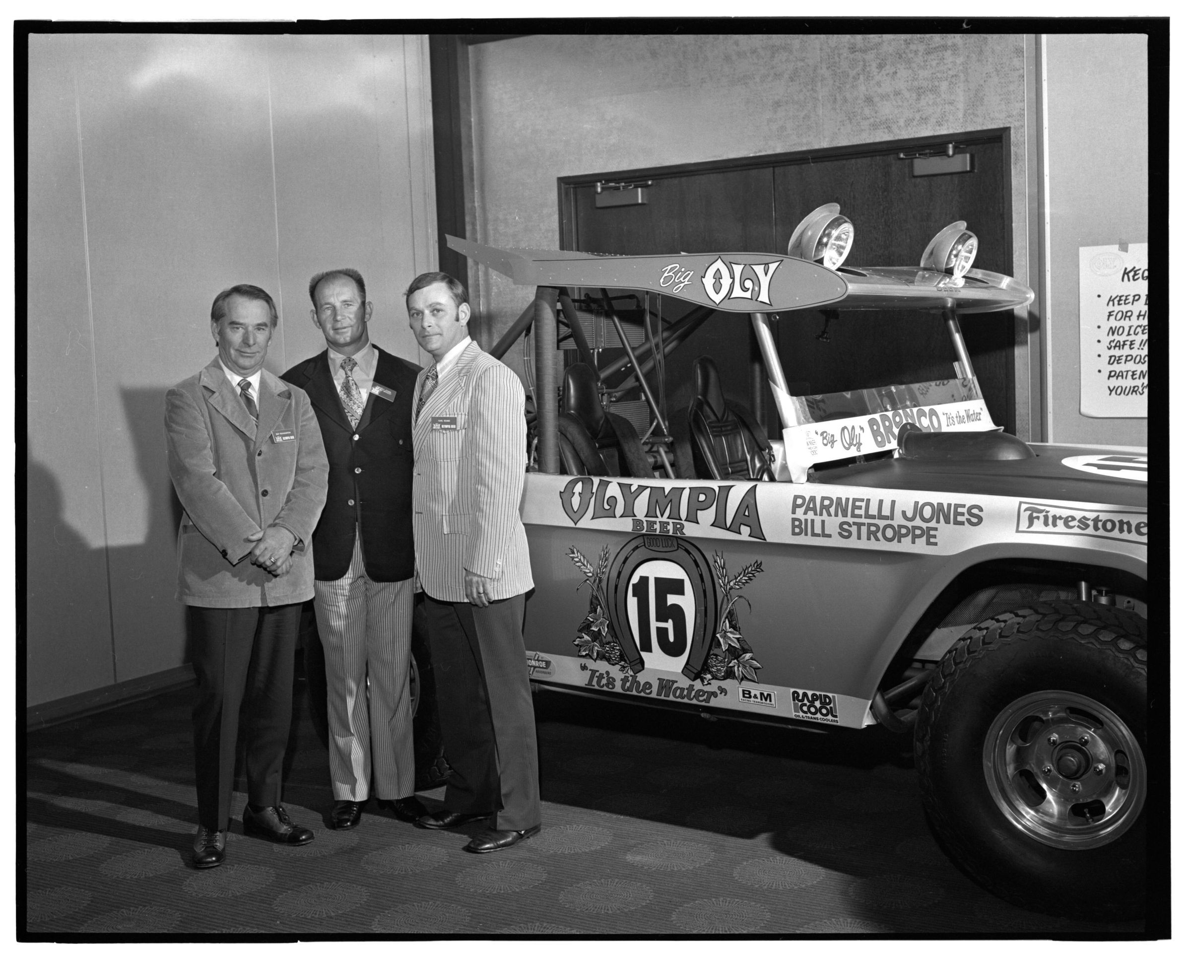 Negative, sheet film. 2 x 3 b&w. 72.131. Olympia Brewery. Parnelli Jones and Bill Stroppe's Big Oly.Olympia brewery sponsored "Big Oly" race car (in races like Baja 500) driven by Parnelli Jones and Bill Stroppe. Jones is man in dark jacket and striped pants. No ID on others. Unknown location.Name/Title