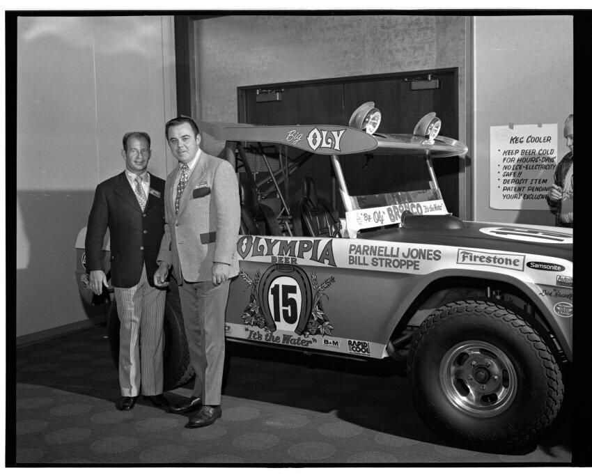 Negative, sheet film. 2 x 3 b&w. 72.131. Olympia brewery sponsored "Big Oly" race car (in races like Baja 500) driven by Parnelli Jones and Bill Stroppe. Jones is man in dark jacket and striped pants. No ID on others. Unknown location.Name/Title