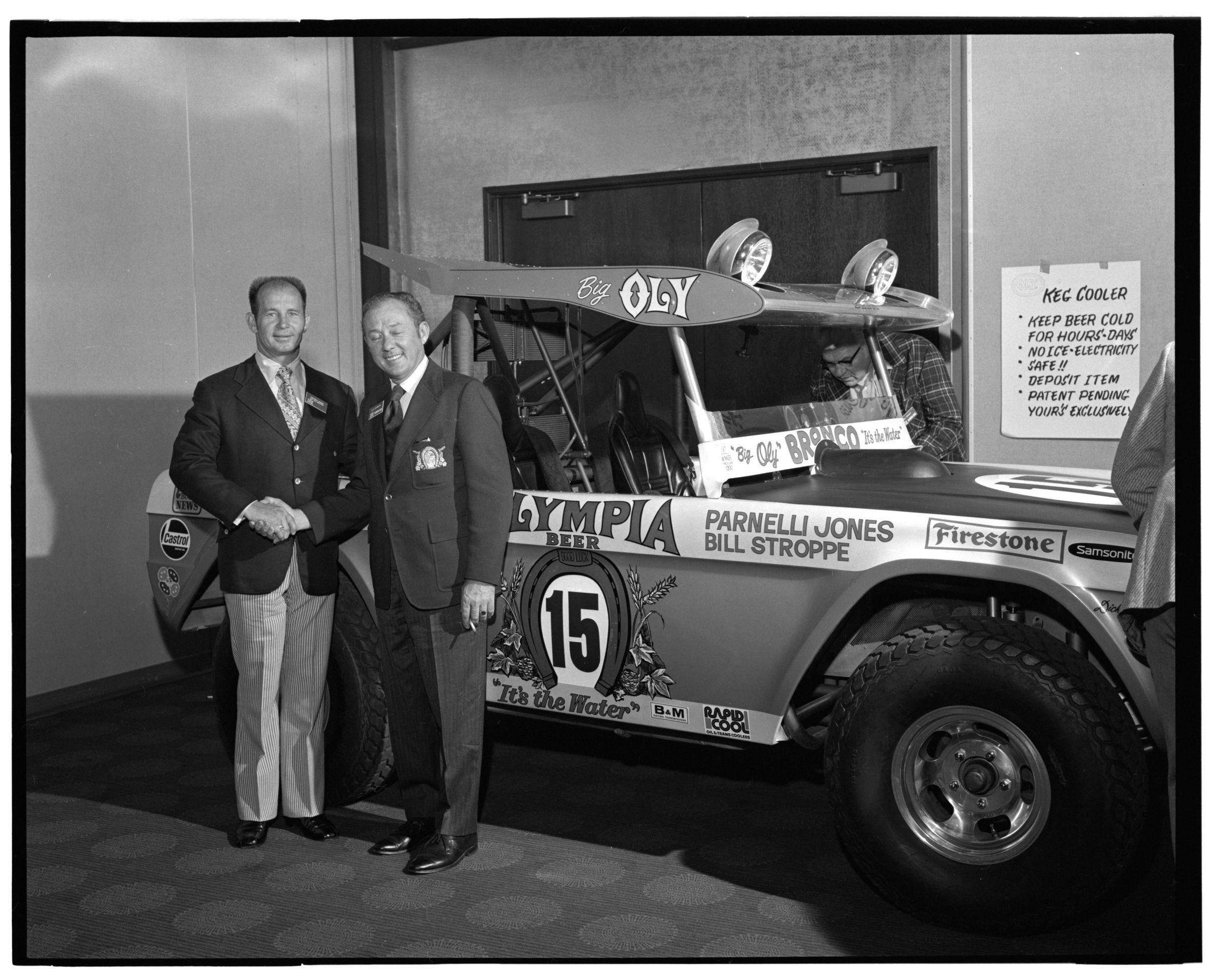 Negative, sheet film. 2 x 3 b&w. 72.131. Olympia brewery sponsored "Big Oly" race car (in races like Baja 500) driven by Parnelli Jones and Bill Stroppe. Jones is man in dark jacket and striped pants. No ID on others. Unknown location.Name/Title