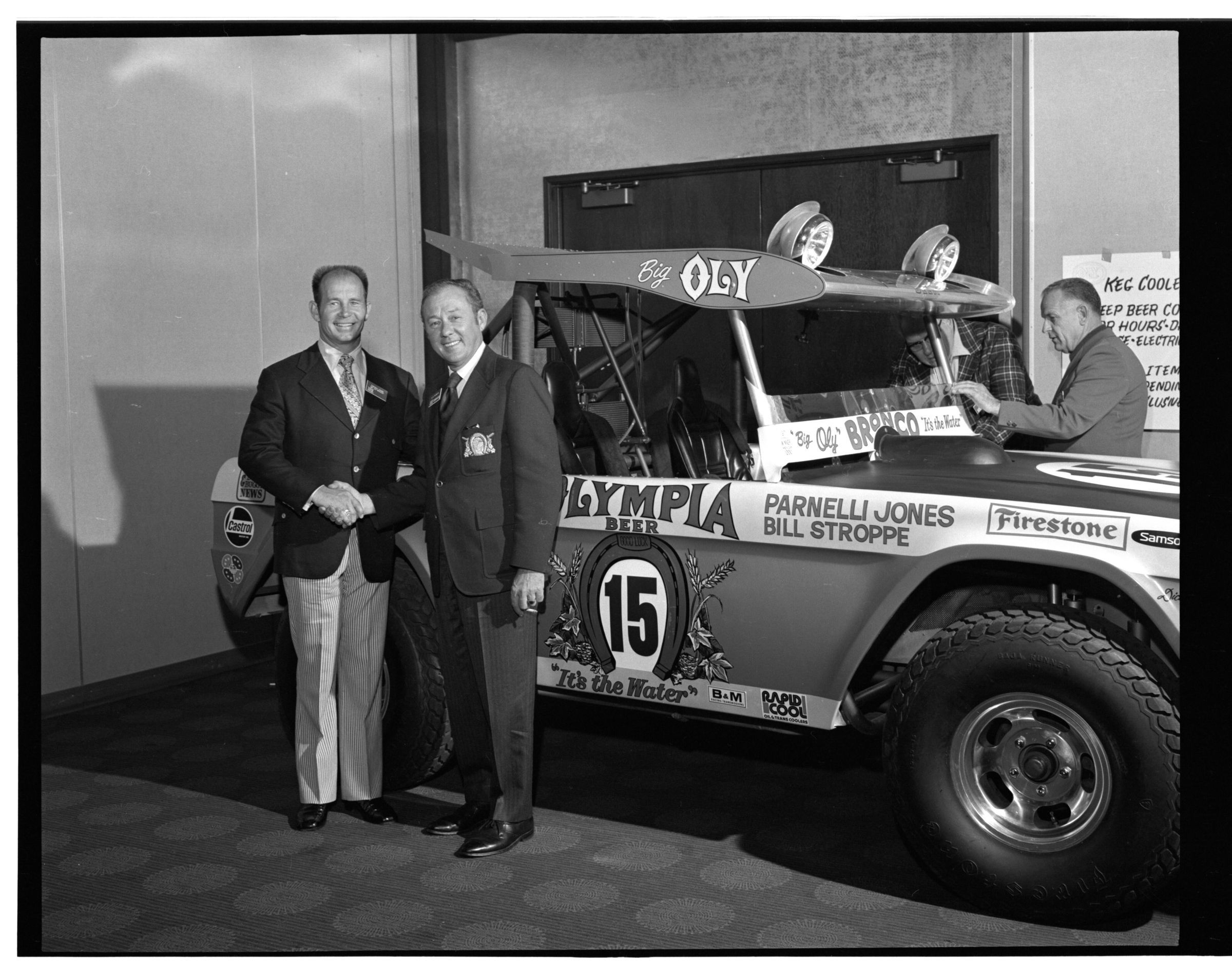 Negative, sheet film. 2 x 3 b&w. 72.131. Olympia brewery sponsored "Big Oly" race car (in races like Baja 500) driven by Parnelli Jones and Bill Stroppe. Jones is man in dark jacket and striped pants. No ID on others. Unknown location.Name/Title