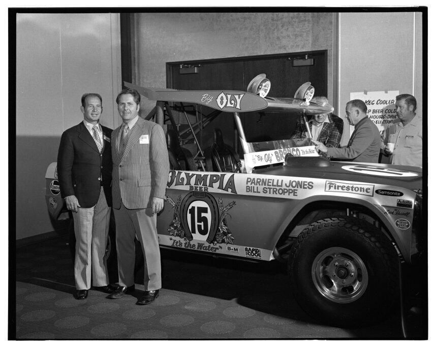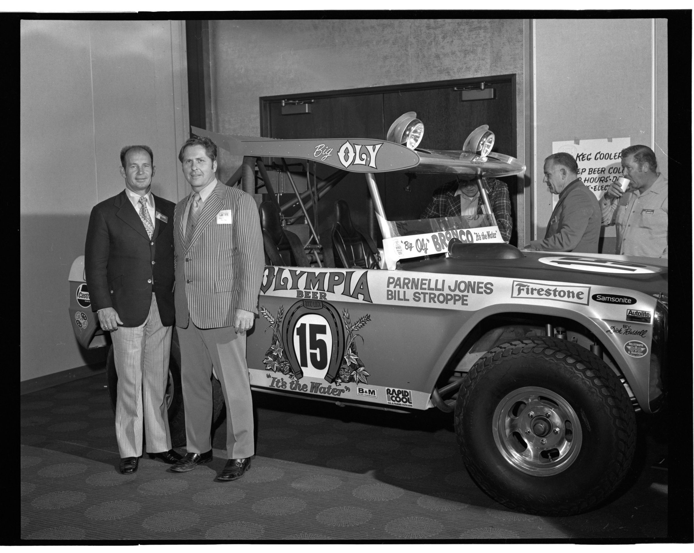 Negative, sheet film. 2 x 3 b&w. 72.131. Olympia brewery sponsored "Big Oly" race car (in races like Baja 500) driven by Parnelli Jones and Bill Stroppe. Jones is man in dark jacket and striped pants. No ID on others. Unknown location.Name/Title