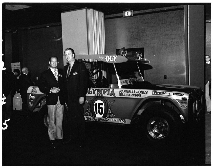Negative, sheet film. 2 x 3 b&w. 72.131. Olympia brewery sponsored "Big Oly" race car (in races like Baja 500) driven by Parnelli Jones and Bill Stroppe. Jones is man in dark jacket and striped pants. No ID on others. Unknown location.Name/Title