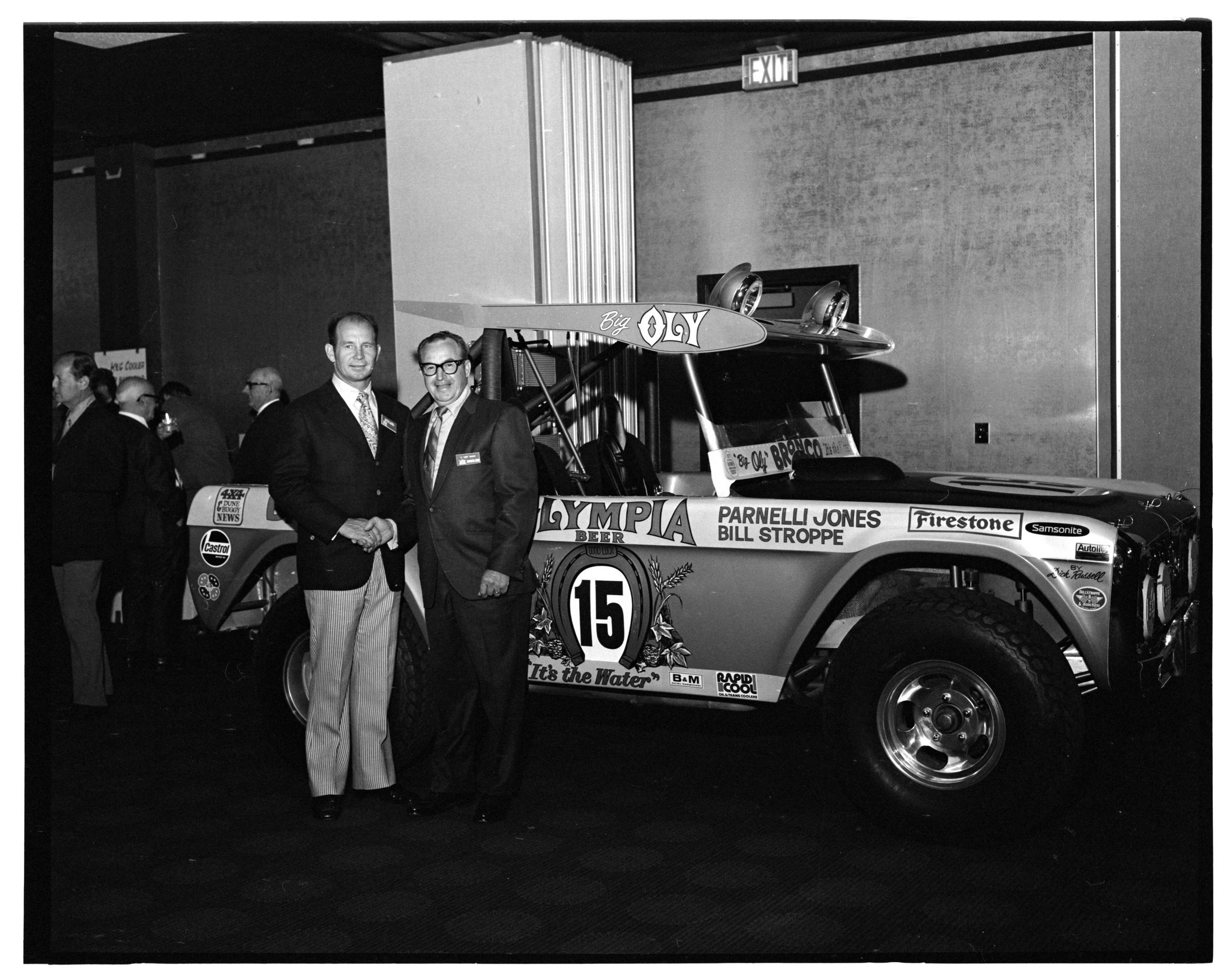 Negative, sheet film. 2 x 3 b&w. 72.131. Olympia brewery sponsored "Big Oly" race car (in races like Baja 500) driven by Parnelli Jones and Bill Stroppe. Jones is man in dark jacket and striped pants. No ID on others. Unknown location.Name/Title
