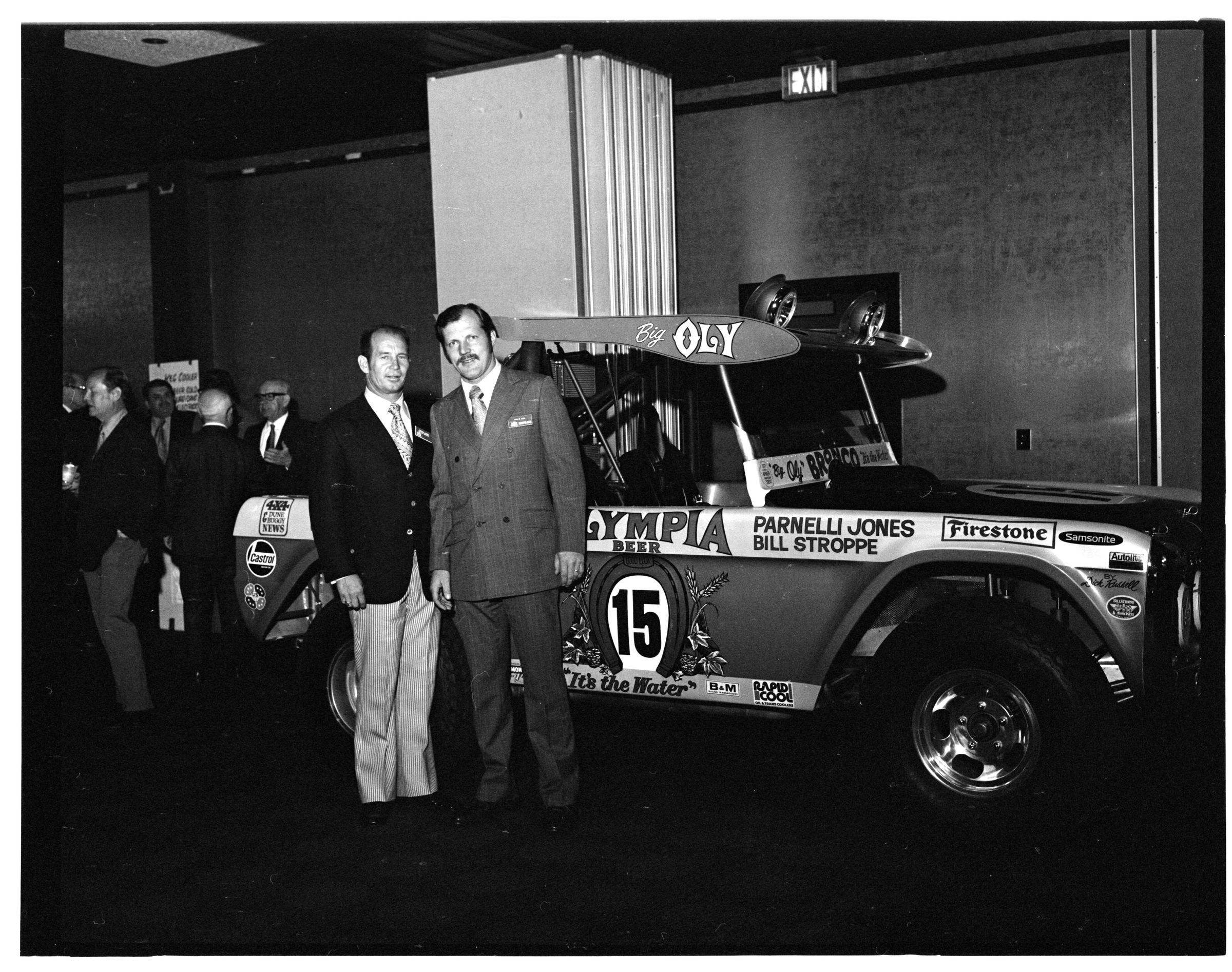 Negative, sheet film. 2 x 3 b&w. 72.131. Olympia brewery sponsored "Big Oly" race car (in races like Baja 500) driven by Parnelli Jones and Bill Stroppe. Jones is man in dark jacket and striped pants. No ID on others. Unknown location.Name/Title