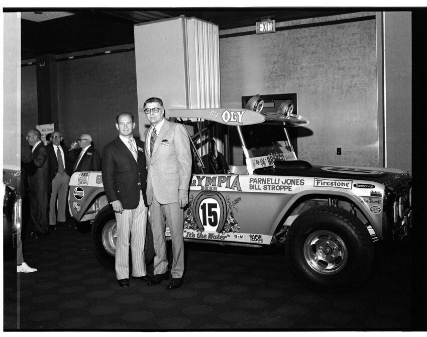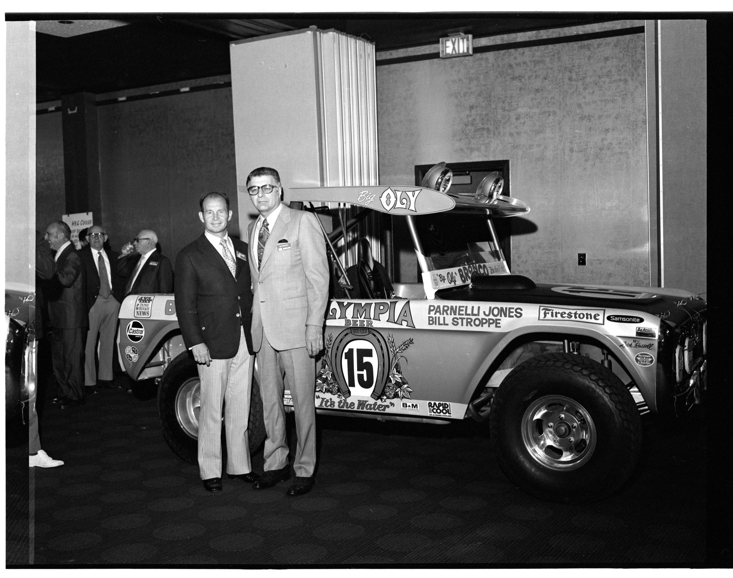 Negative, sheet film. 2 x 3 b&w. 72.131. Olympia brewery sponsored "Big Oly" race car (in races like Baja 500) driven by Parnelli Jones and Bill Stroppe. Jones is man in dark jacket and striped pants. No ID on others. Unknown location.Name/Title