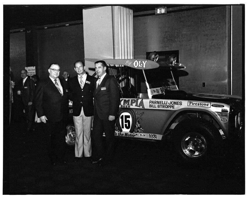 Negative, sheet film. 2 x 3 b&w. 72.131. Olympia brewery sponsored "Big Oly" race car (in races like Baja 500) driven by Parnelli Jones and Bill Stroppe. Jones is man in dark jacket and striped pants. No ID on others. Unknown location.Name/Title