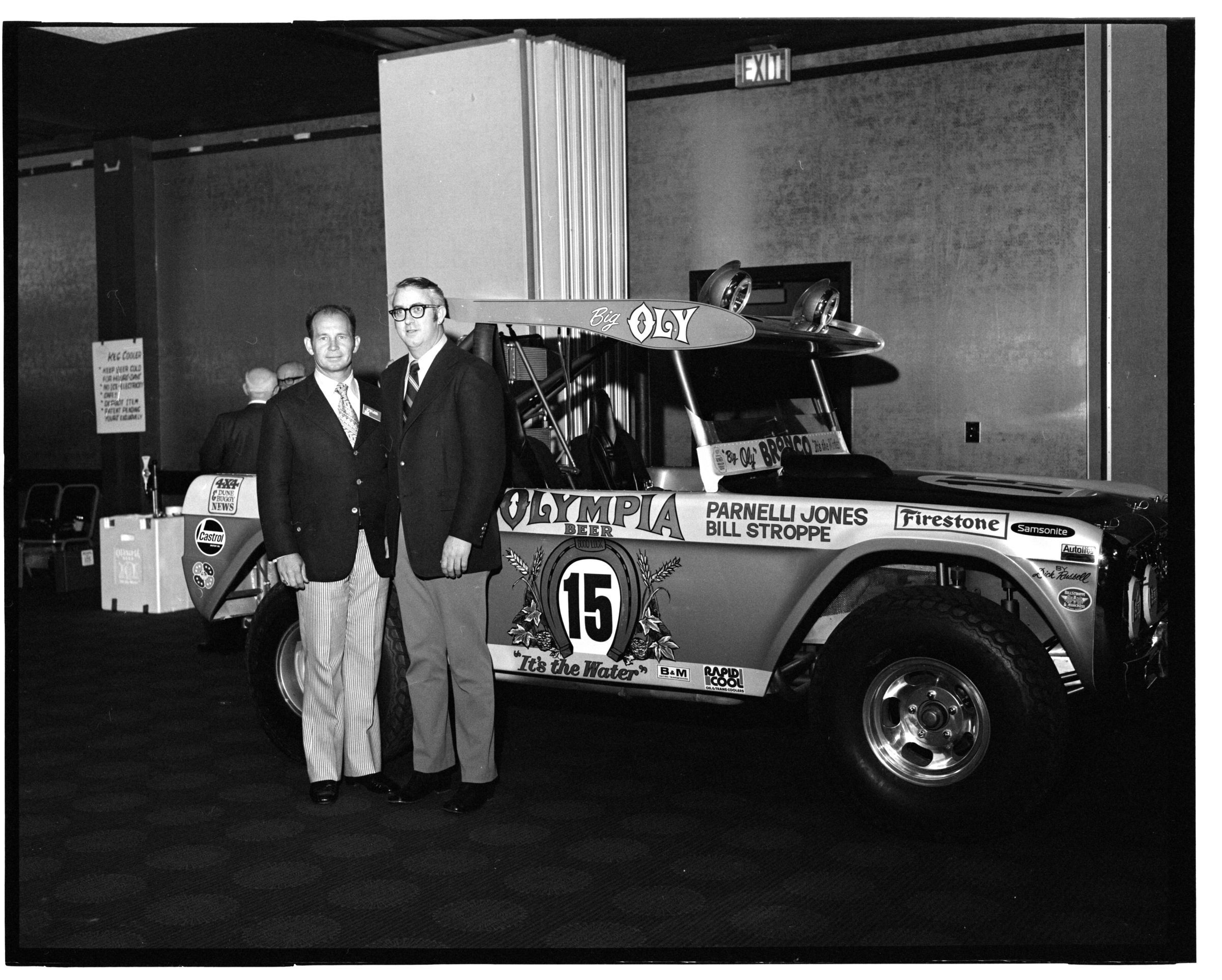 Negative, sheet film. 2 x 3 b&w. 72.131. Olympia brewery sponsored "Big Oly" race car (in races like Baja 500) driven by Parnelli Jones and Bill Stroppe. Jones is man in dark jacket and striped pants. No ID on others. Unknown location.Name/Title