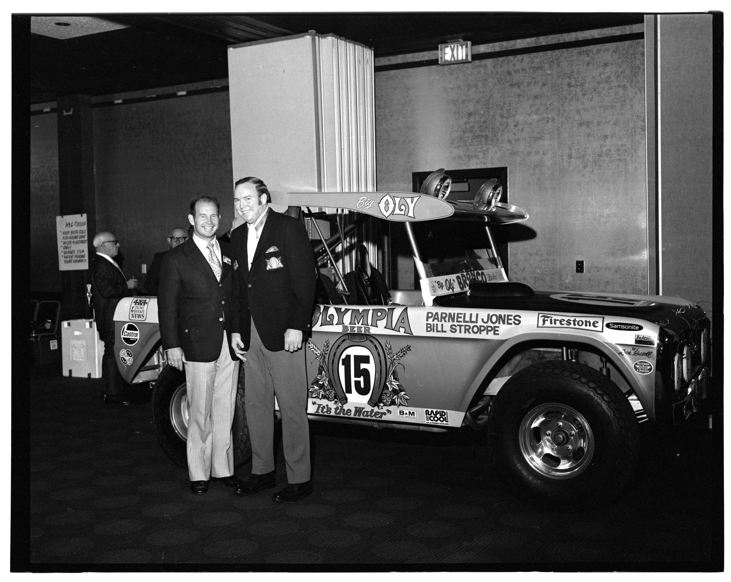 Negative, sheet film. 2 x 3 b&w. 72.131. Olympia brewery sponsored "Big Oly" race car (in races like Baja 500) driven by Parnelli Jones and Bill Stroppe. Jones is man in dark jacket and striped pants. No ID on others. Unknown location.Name/Title