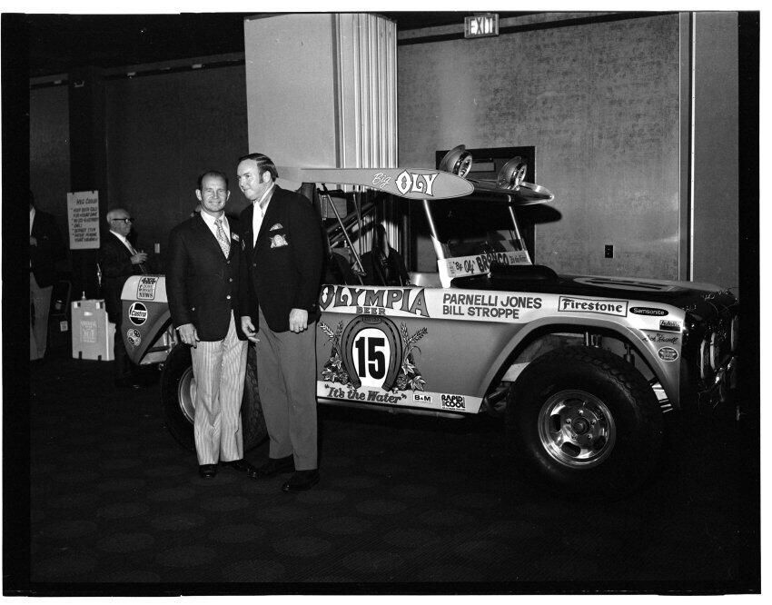 Negative, sheet film. 2 x 3 b&w. 72.131. Olympia brewery sponsored "Big Oly" race car (in races like Baja 500) driven by Parnelli Jones and Bill Stroppe. Jones is man in dark jacket and striped pants. No ID on others. Unknown location.Name/Title