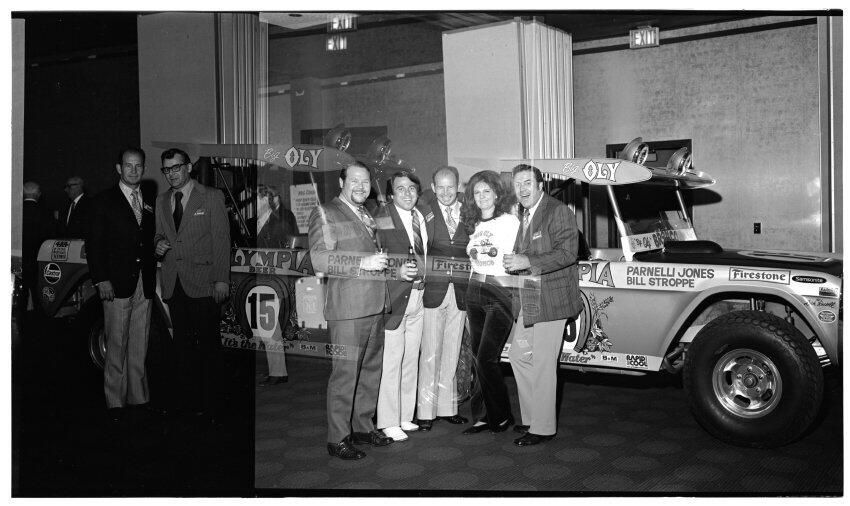 Negative, sheet film. 2 x 4 b&w. 72.131. Olympia brewery sponsored "Big Oly" race car (in races like Baja 500) driven by Parnelli Jones and Bill Stroppe. Jones is man in dark jacket and striped pants. No ID on others. Unknown location.Name/Title