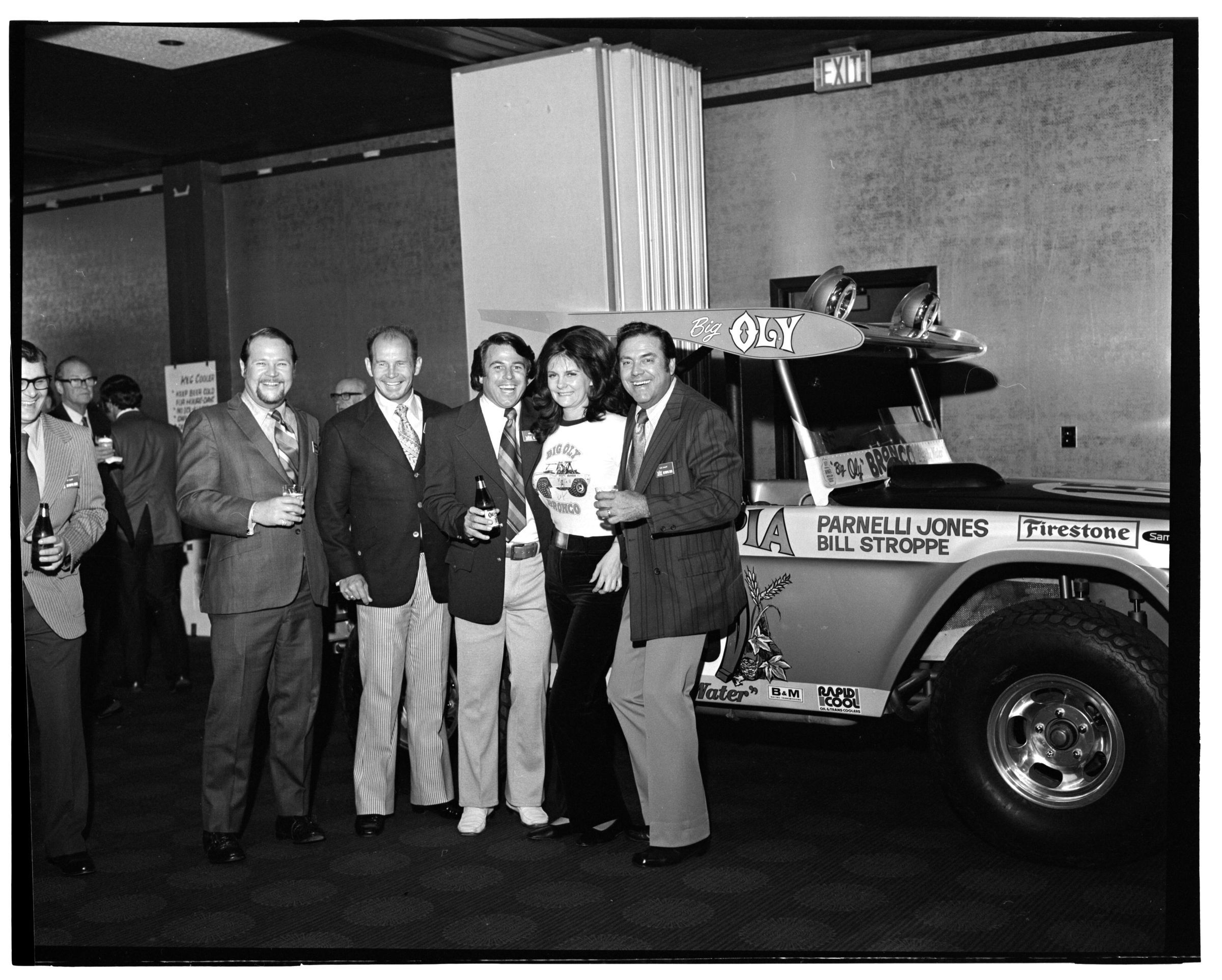 Negative, sheet film. 2 x 3 b&w. 72.131. Olympia brewery sponsored "Big Oly" race car (in races like Baja 500) driven by Parnelli Jones and Bill Stroppe. Jones is man in dark jacket and striped pants. No ID on others. Unknown location.Name/Title