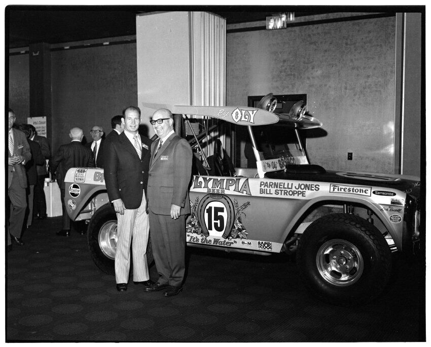 Negative, sheet film. 2 x 3 b&w. 72.131. Olympia brewery sponsored "Big Oly" race car (in races like Baja 500) driven by Parnelli Jones and Bill Stroppe. Jones is man in dark jacket and striped pants. No ID on others. Unknown location.Name/Title