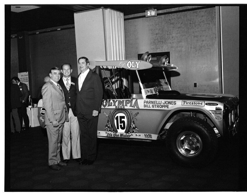 Negative, sheet film. 2 x 3 b&w. 72.131. Olympia brewery sponsored "Big Oly" race car (in races like Baja 500) driven by Parnelli Jones and Bill Stroppe. Jones is man in dark jacket and striped pants. No ID on others. Unknown location.Name/Title
