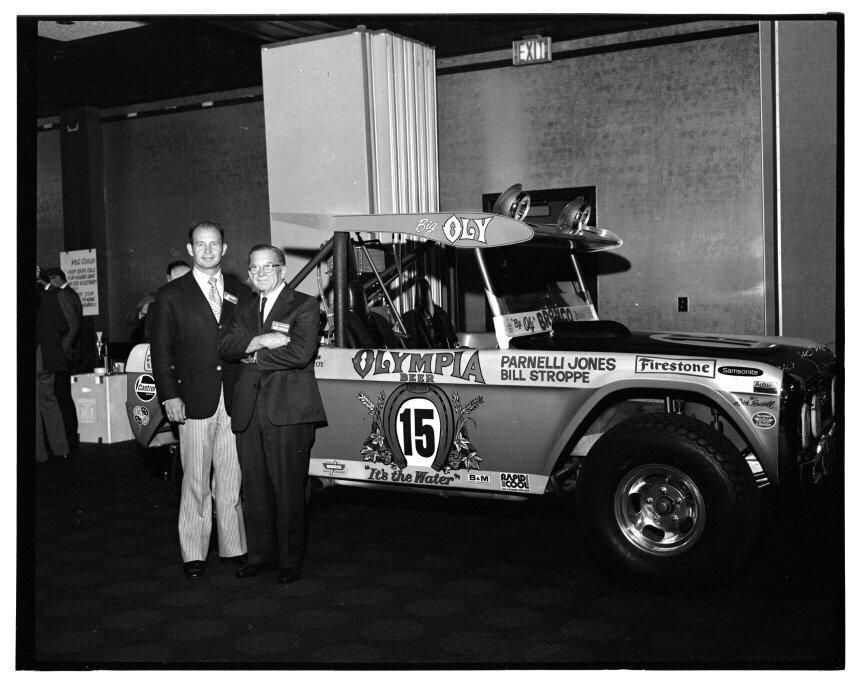 Negative, sheet film. 2 x 3 b&w. 72.131. Olympia brewery sponsored "Big Oly" race car (in races like Baja 500) driven by Parnelli Jones and Bill Stroppe. Jones is man in dark jacket and striped pants. No ID on others. Unknown location.Name/Title