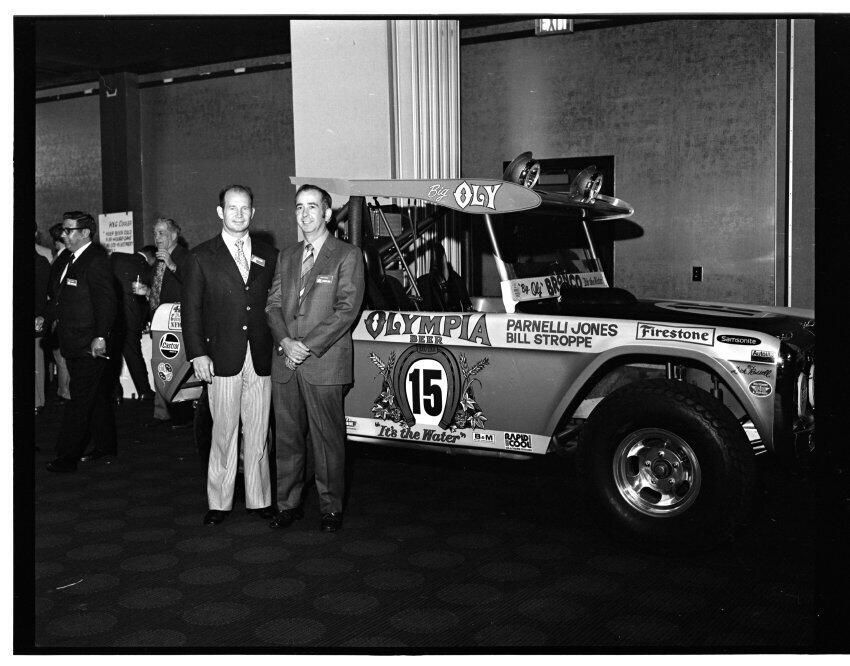 Negative, sheet film. 2 x 3 b&w. 72.131. Olympia brewery sponsored "Big Oly" race car (in races like Baja 500) driven by Parnelli Jones and Bill Stroppe. Jones is man in dark jacket and striped pants. No ID on others. Unknown location.Name/Title