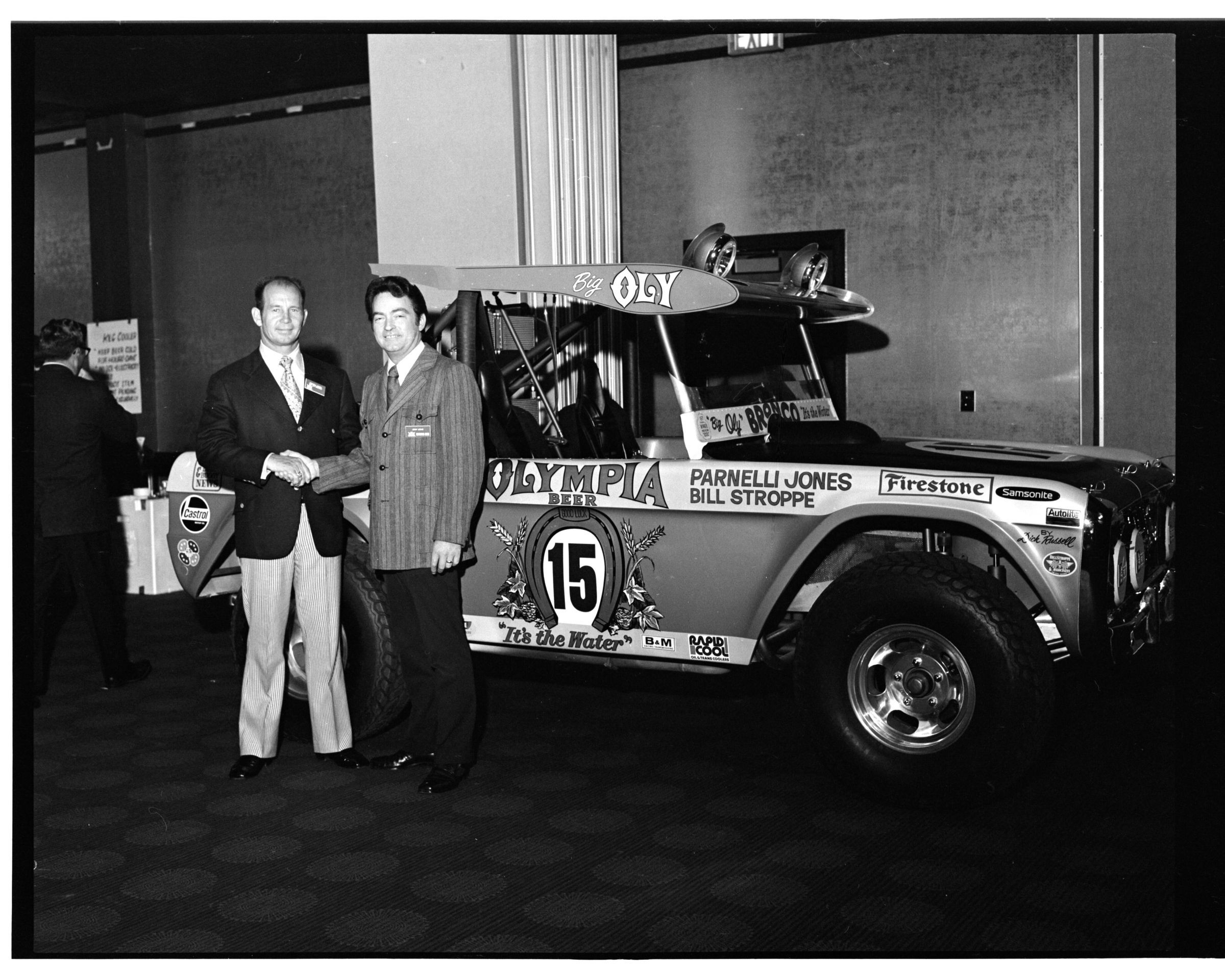 Negative, sheet film. 2 x 3 b&w. 72.131. Olympia brewery sponsored "Big Oly" race car (in races like Baja 500) driven by Parnelli Jones and Bill Stroppe. Jones is man in dark jacket and striped pants. No ID on others. Unknown location.Name/Title