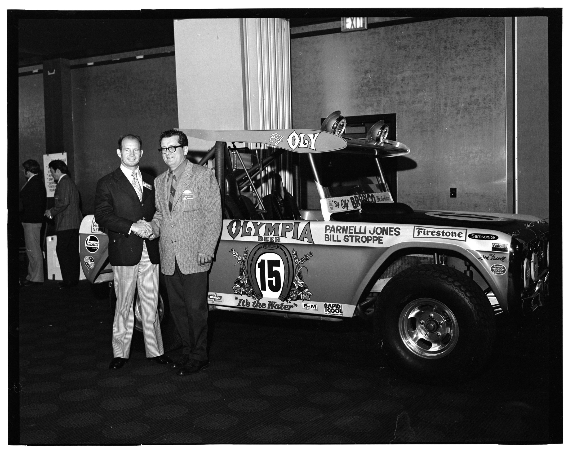Negative, sheet film. 2 x 3 b&w. 72.131. Olympia brewery sponsored "Big Oly" race car (in races like Baja 500) driven by Parnelli Jones and Bill Stroppe. Jones is man in dark jacket and striped pants. No ID on others. Unknown location.Name/Title