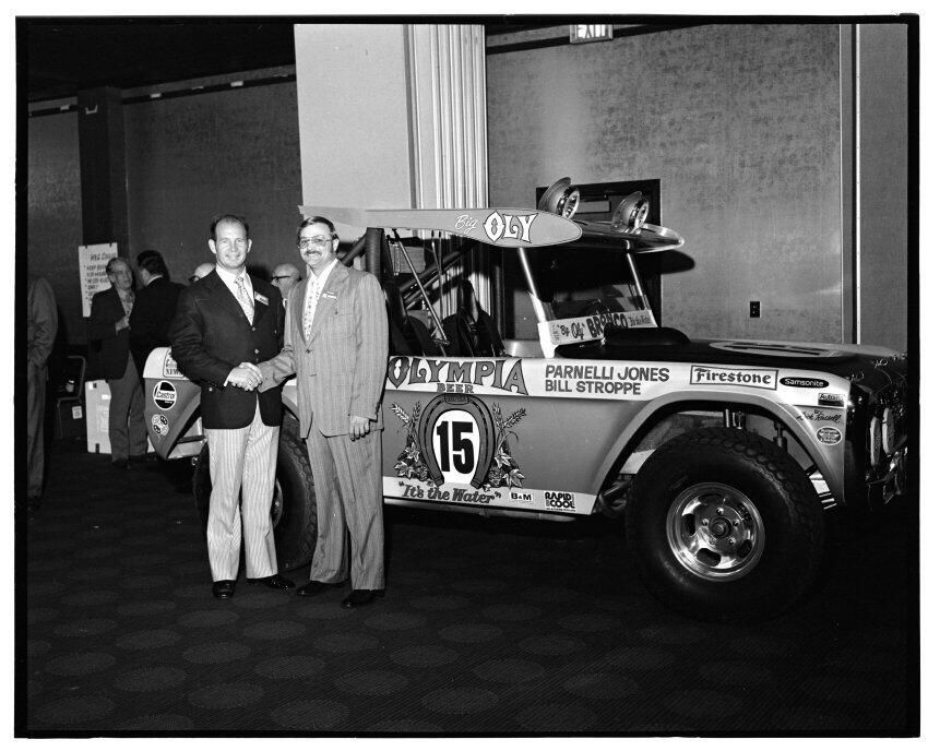 Negative, sheet film. 2 x 3 b&w. 72.131. Olympia brewery sponsored "Big Oly" race car (in races like Baja 500) driven by Parnelli Jones and Bill Stroppe. Jones is man in dark jacket and striped pants. No ID on others. Unknown location.Name/Title