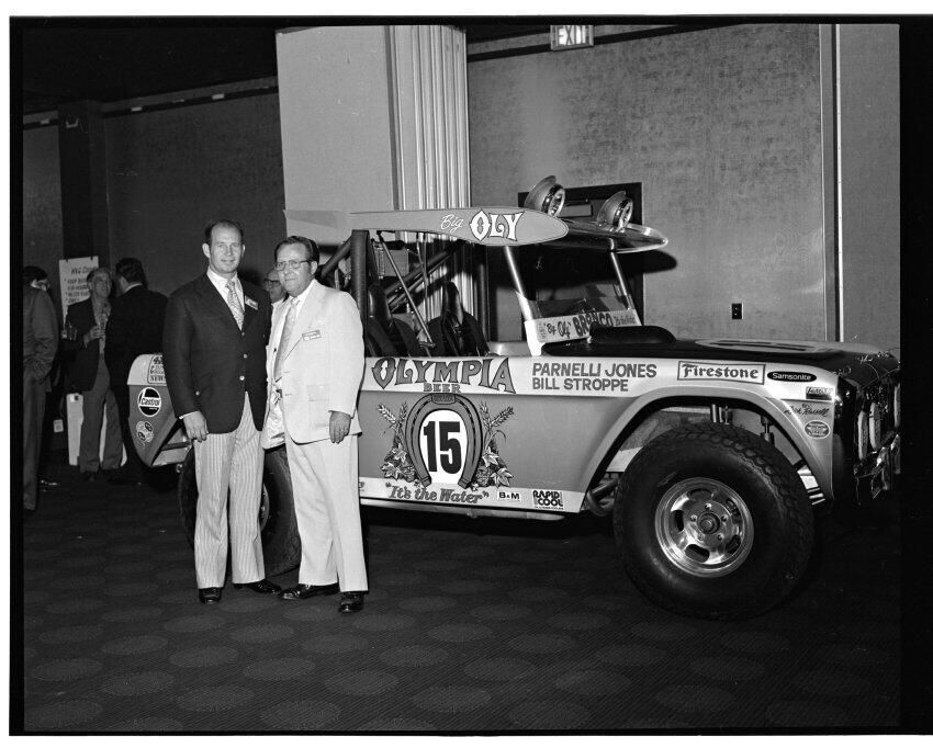 Negative, sheet film. 2 x 3 b&w. 72.131. Olympia brewery sponsored "Big Oly" race car (in races like Baja 500) driven by Parnelli Jones and Bill Stroppe. Jones is man in dark jacket and striped pants. No ID on others. Unknown location.Name/Title