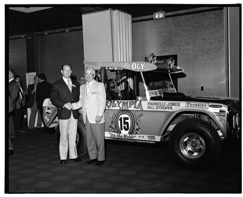 Negative, sheet film. 2 x 3 b&w. 72.131. Olympia brewery sponsored "Big Oly" race car (in races like Baja 500) driven by Parnelli Jones and Bill Stroppe. Jones is man in dark jacket and striped pants. No ID on others. Unknown location.Name/Title