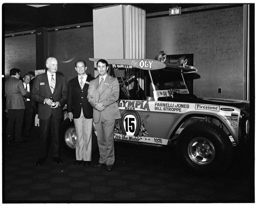 Negative, sheet film. 2 x 3 b&w. 72.131. Olympia brewery sponsored "Big Oly" race car (in races like Baja 500) driven by Parnelli Jones and Bill Stroppe. Jones is man in dark jacket and striped pants. No ID on others. Unknown location.Name/Title