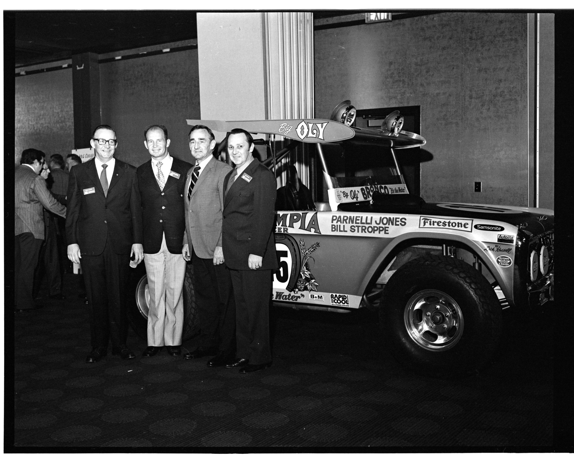 Negative, sheet film. 2 x 3 b&w. 72.131. Olympia brewery sponsored "Big Oly" race car (in races like Baja 500) driven by Parnelli Jones and Bill Stroppe. Jones is man in dark jacket and striped pants. Left to right: Bobby Schmidt, Jones, Bink Schmidt, Skip Schmidt. Unknown location.Name/Title