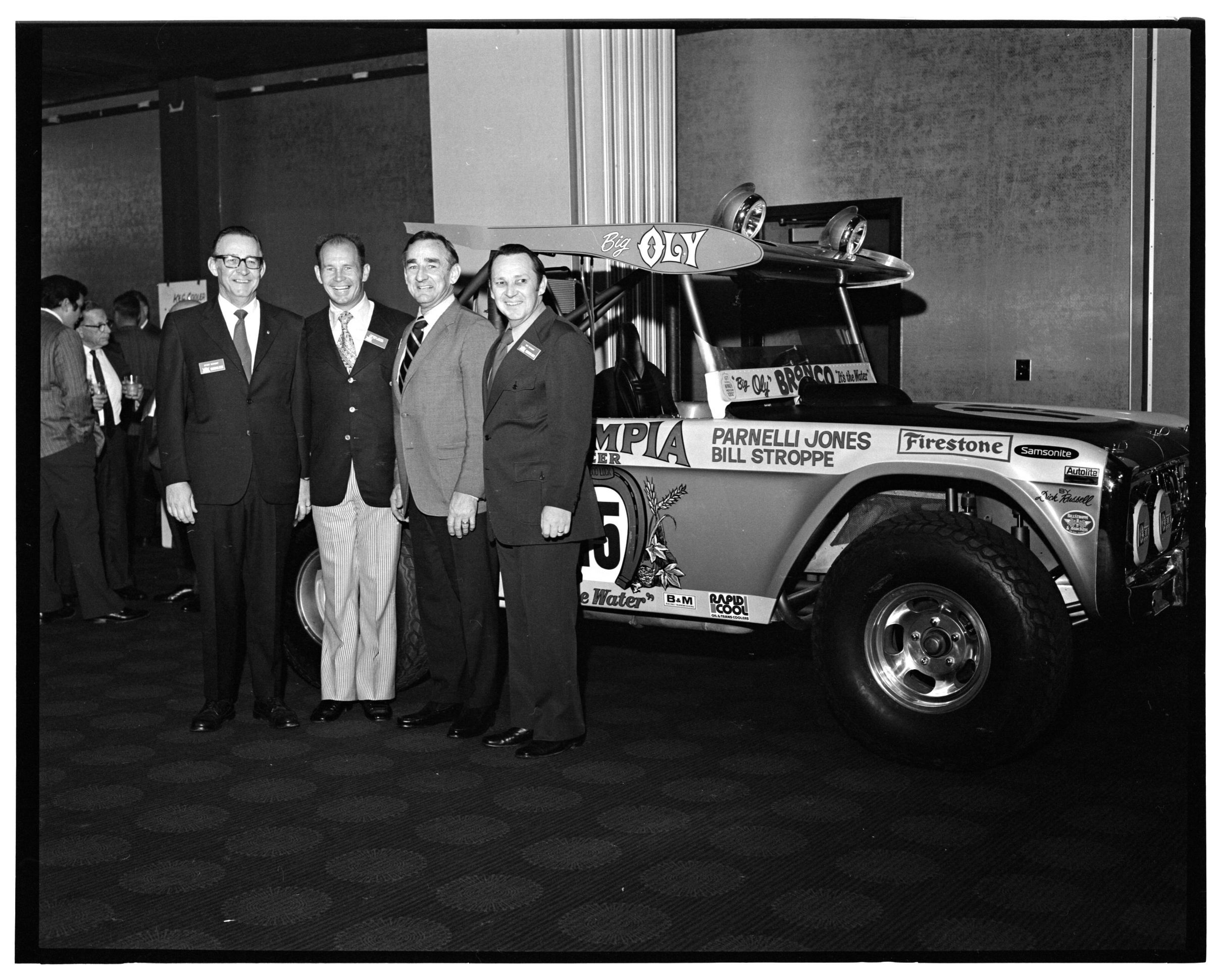 Negative, sheet film. 2 x 3 b&w. 72.131. Olympia brewery sponsored "Big Oly" race car (in races like Baja 500) driven by Parnelli Jones and Bill Stroppe. Jones is man in dark jacket and striped pants. Left to right: Bobby Schmidt, Jones, Bink Schmidt, Skip Schmidt. Unknown location.Name/Title