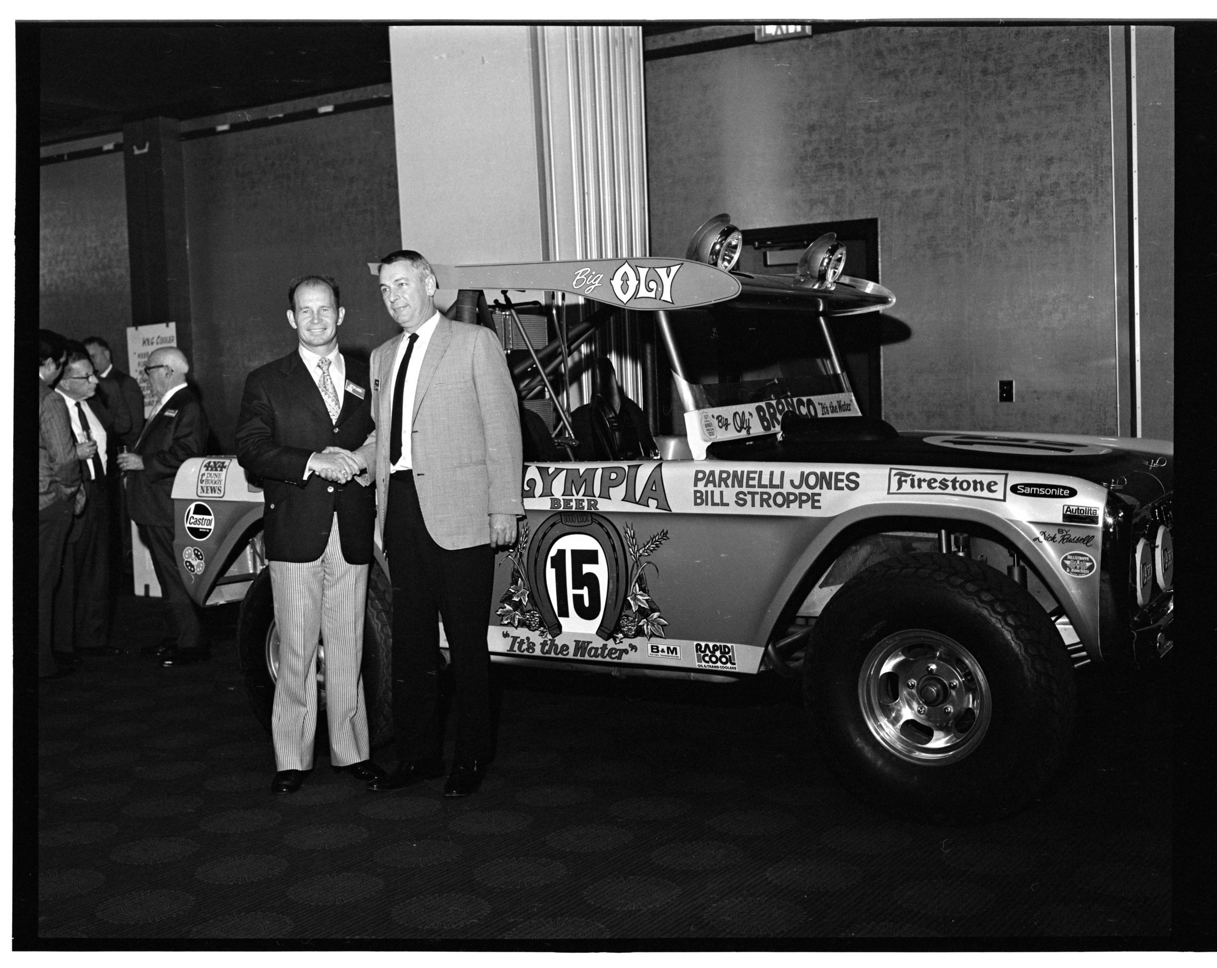 Negative, sheet film. 2 x 3 b&w. 72.131. Olympia brewery sponsored "Big Oly" race car (in races like Baja 500) driven by Parnelli Jones and Bill Stroppe. Jones is man in dark jacket and striped pants. No ID on others. Unknown location.Name/Title