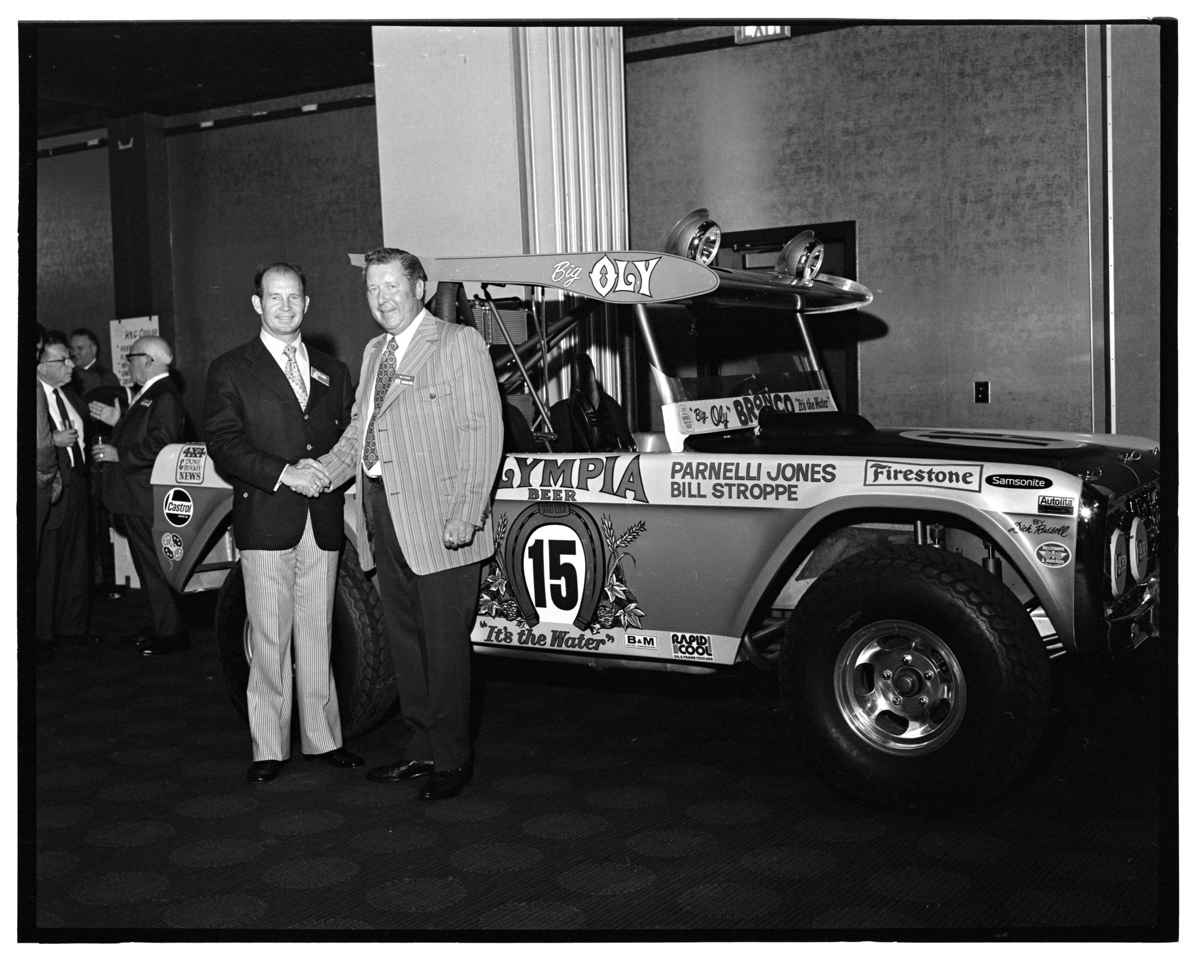 Negative, sheet film. 2 x 3 b&w. 72.131. Olympia brewery sponsored "Big Oly" race car (in races like Baja 500) driven by Parnelli Jones and Bill Stroppe. Jones is man in dark jacket and striped pants. No ID on others. Unknown location.Name/Title