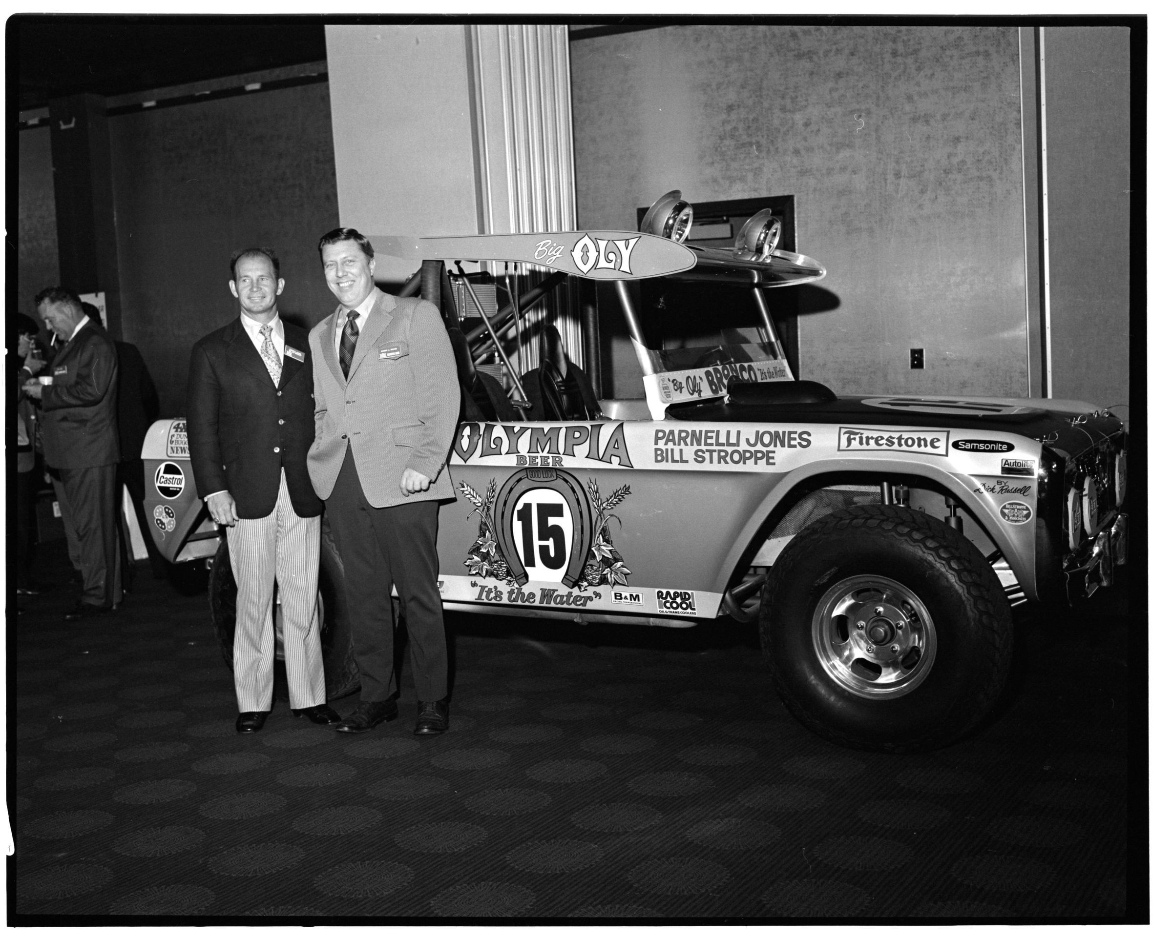 Negative, sheet film. 2 x 3 b&w. 72.131. Olympia brewery sponsored "Big Oly" race car (in races like Baja 500) driven by Parnelli Jones and Bill Stroppe. Jones is man in dark jacket and striped pants. No ID on others. Unknown location.Name/Title