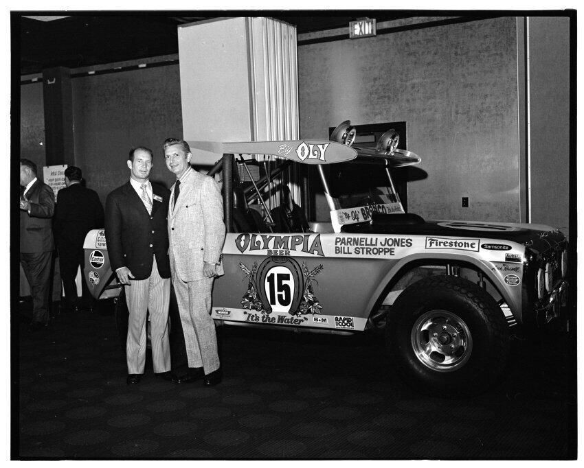 Negative, sheet film. 2 x 3 b&w. 72.131. Olympia brewery sponsored "Big Oly" race car (in races like Baja 500) driven by Parnelli Jones and Bill Stroppe. Jones is man in dark jacket and striped pants. No ID on others. Unknown location.Name/Title
