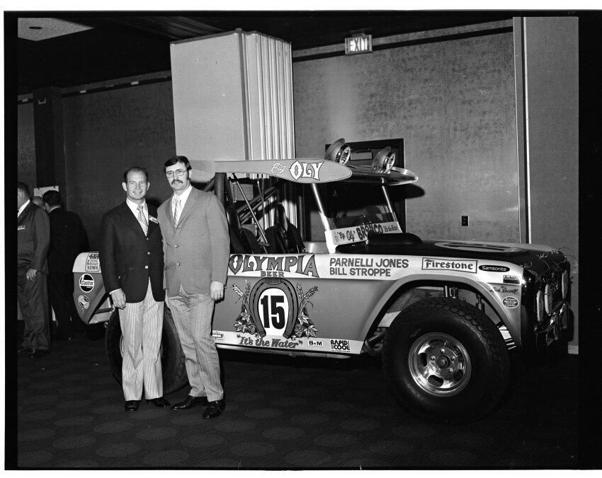 Negative, sheet film. 2 x 3 b&w. 72.131. Olympia brewery sponsored "Big Oly" race car (in races like Baja 500) driven by Parnelli Jones and Bill Stroppe. Jones is man in dark jacket and striped pants. No ID on others. Unknown location.Name/Title