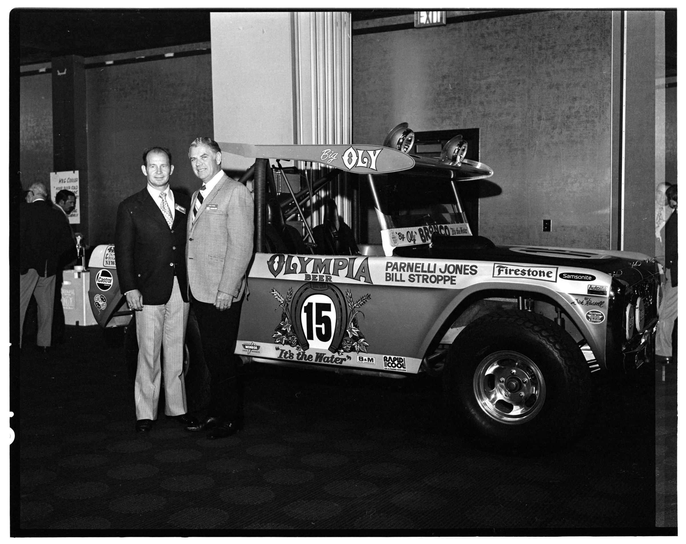 Negative, sheet film. 2 x 3 b&w. 72.131. Olympia brewery sponsored "Big Oly" race car (in races like Baja 500) driven by Parnelli Jones and Bill Stroppe. Jones is man in dark jacket and striped pants. No ID on others. Unknown location.Name/Title