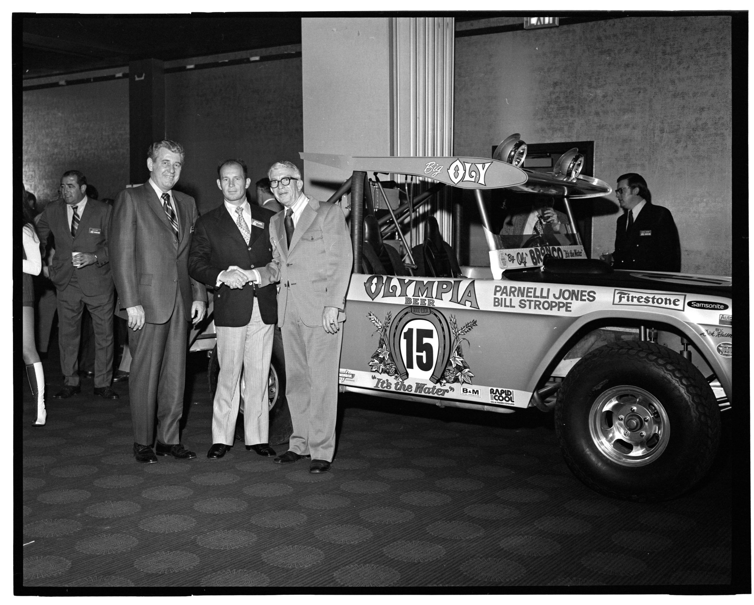 Negative, sheet film. 2 x 3 b&w. 72.131. Olympia brewery sponsored "Big Oly" race car (in races like Baja 500) driven by Parnelli Jones and Bill Stroppe. Jones is man in dark jacket and striped pants. No ID on others. Unknown location.Name/Title