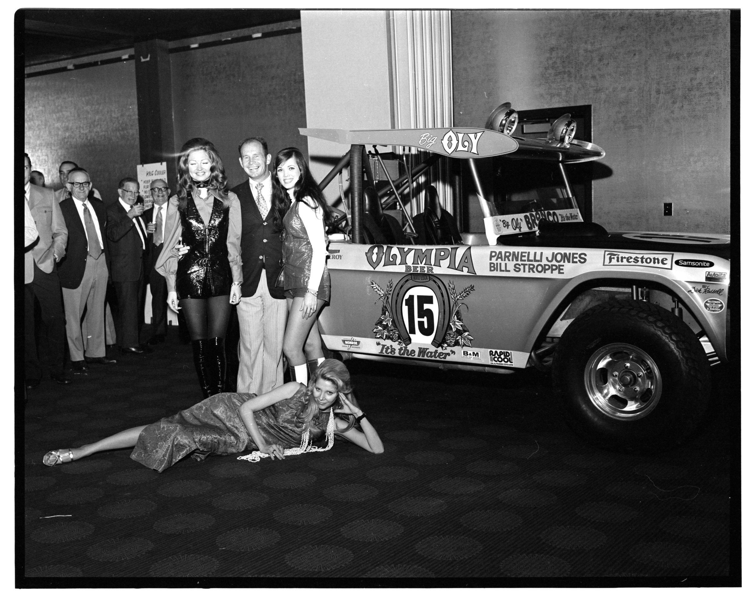 Negative, sheet film. 2 x 3 b&w. 72.131. Olympia brewery sponsored "Big Oly" race car (in races like Baja 500) driven by Parnelli Jones and Bill Stroppe. Jones is man in dark jacket and striped pants. No ID on others. Unknown location.Name/Title