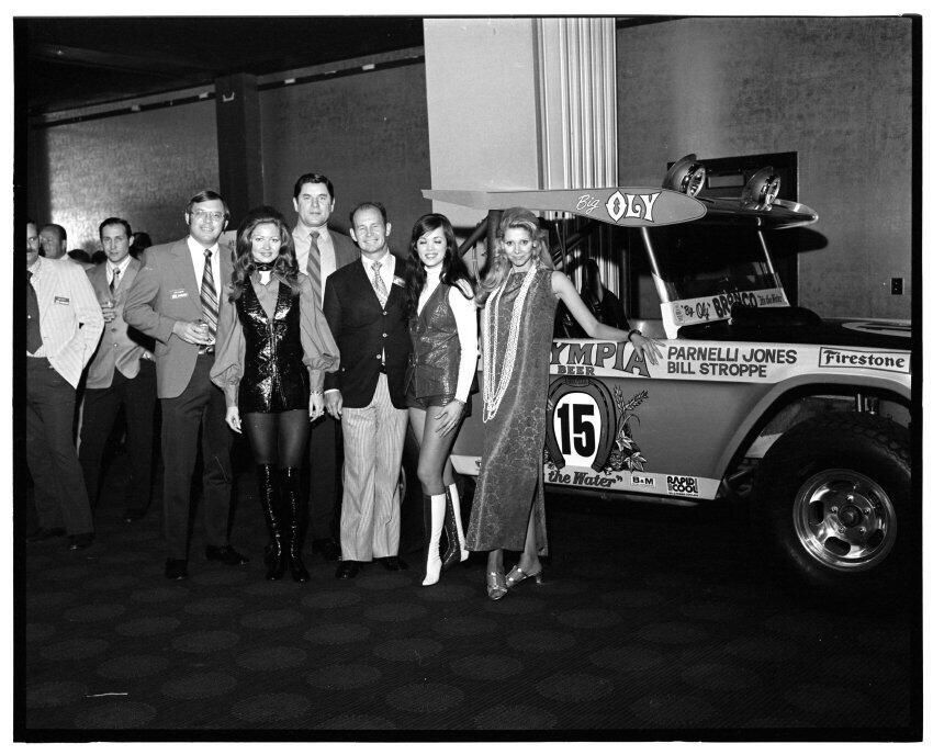 Negative, sheet film. 2 x 3 b&w. 72.131. Olympia brewery sponsored "Big Oly" race car (in races like Baja 500) driven by Parnelli Jones and Bill Stroppe. Jones is man in dark jacket and striped pants. No ID on others. Unknown location.Name/Title