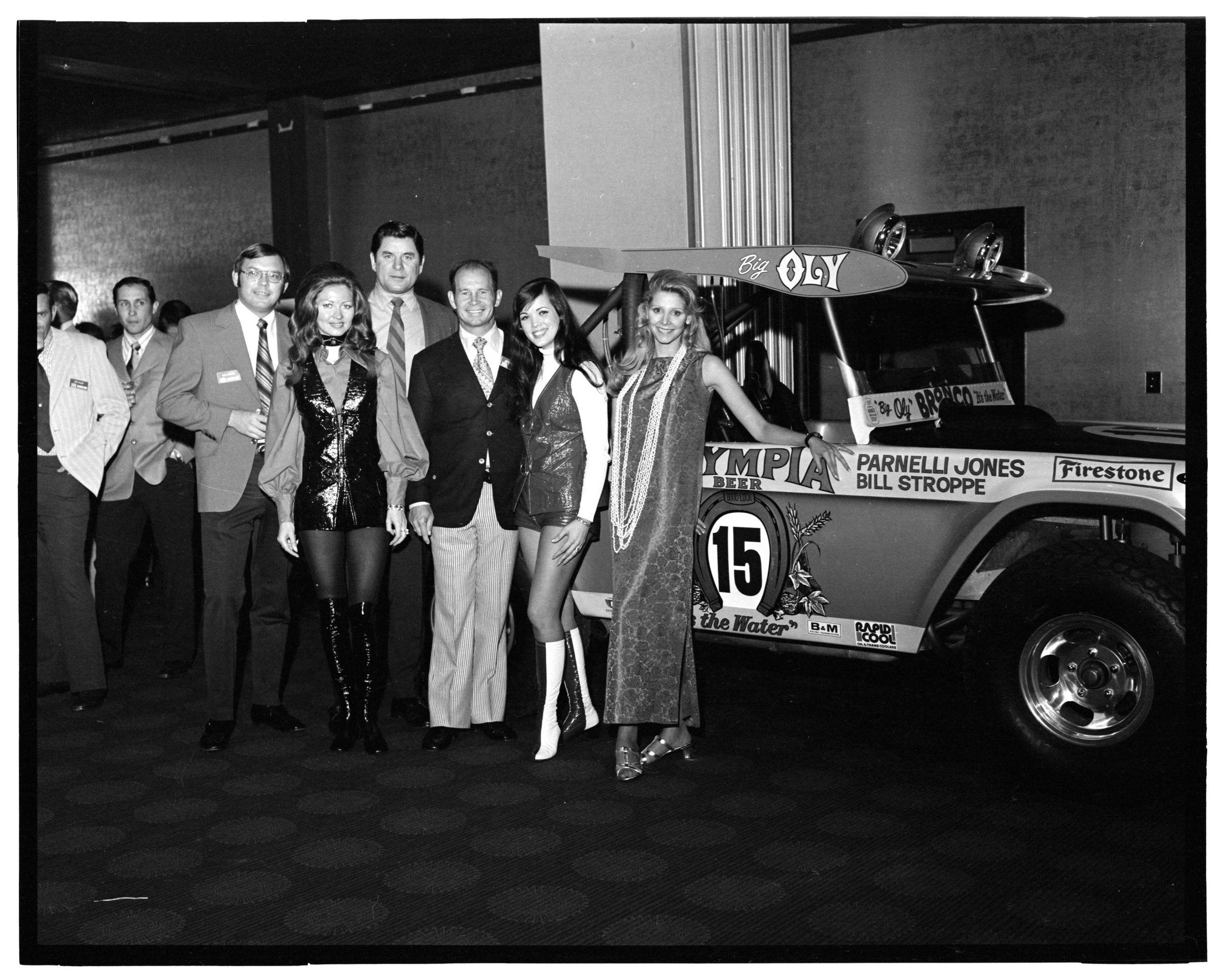 Negative, sheet film. 2 x 3 b&w. 72.131. Olympia brewery sponsored "Big Oly" race car (in races like Baja 500) driven by Parnelli Jones and Bill Stroppe. Jones is man in dark jacket and striped pants. No ID on others. Unknown location.Name/Title