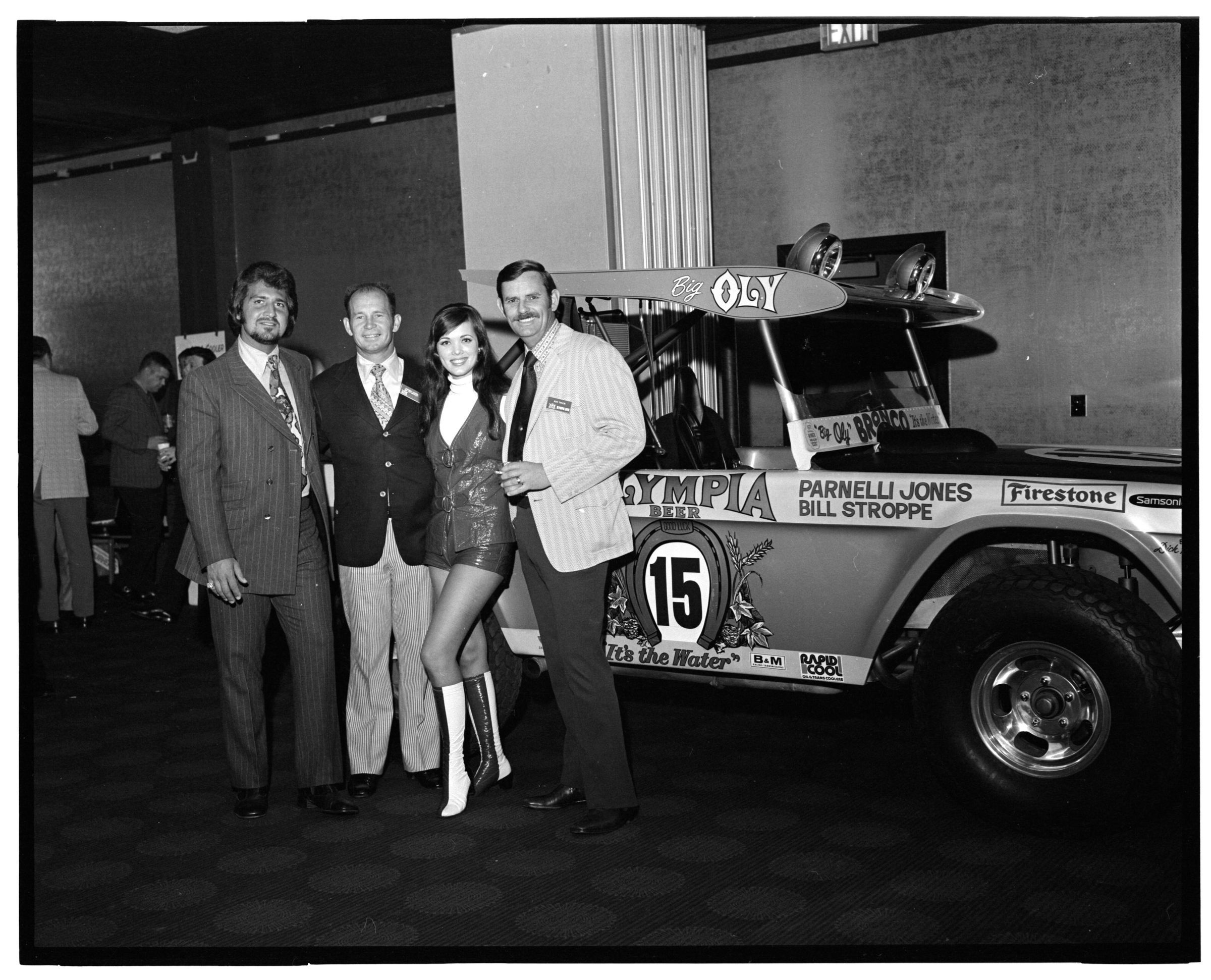 Negative, sheet film. 2 x 3 b&w. 72.131. Olympia brewery sponsored "Big Oly" race car (in races like Baja 500) driven by Parnelli Jones and Bill Stroppe. Jones is man in dark jacket and striped pants. No ID on others. Unknown location.Name/Title