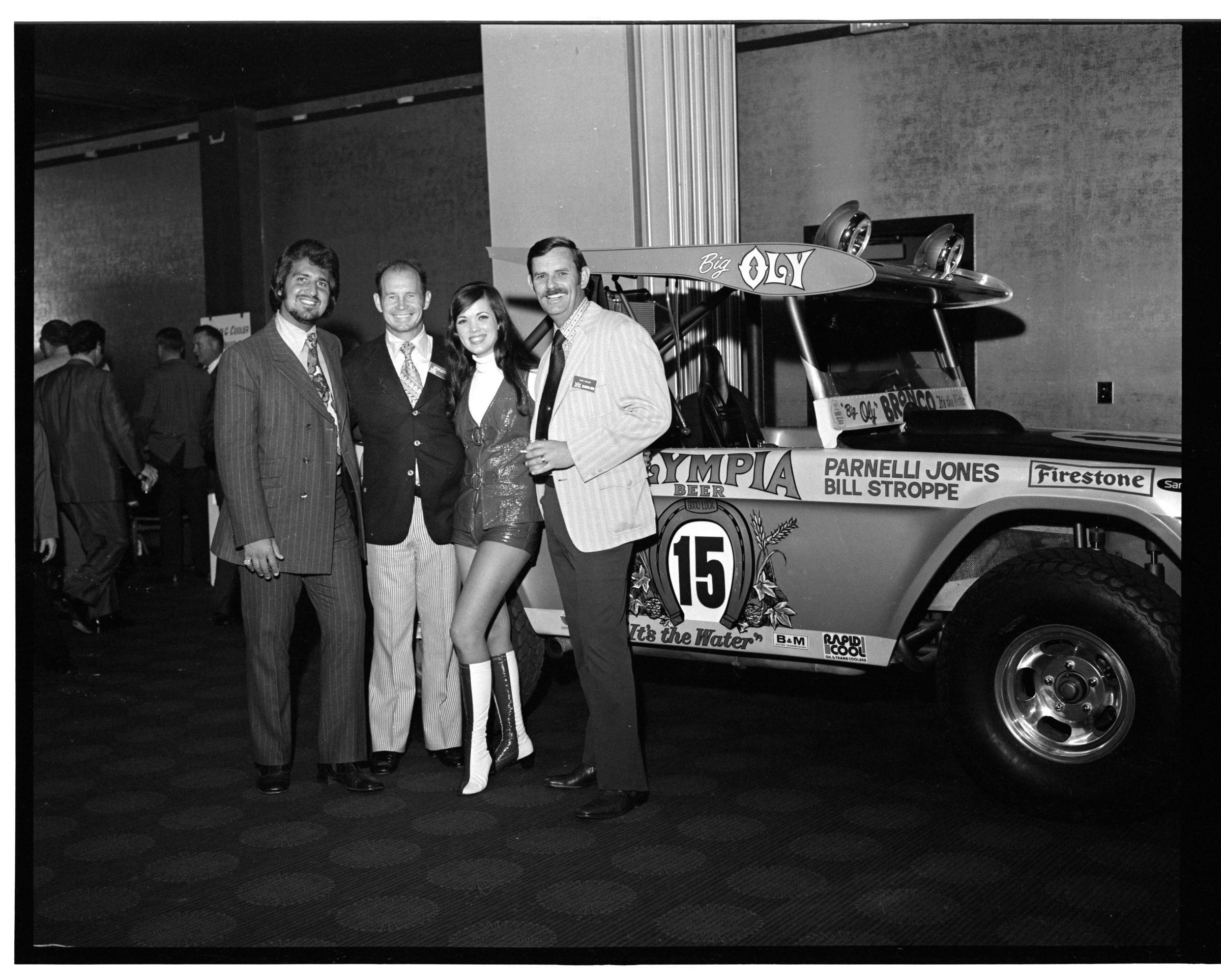 Negative, sheet film. 2 x 3 b&w. 72.131. Olympia brewery sponsored "Big Oly" race car (in races like Baja 500) driven by Parnelli Jones and Bill Stroppe. Jones is man in dark jacket and striped pants. No ID on others. Unknown location.Name/Title