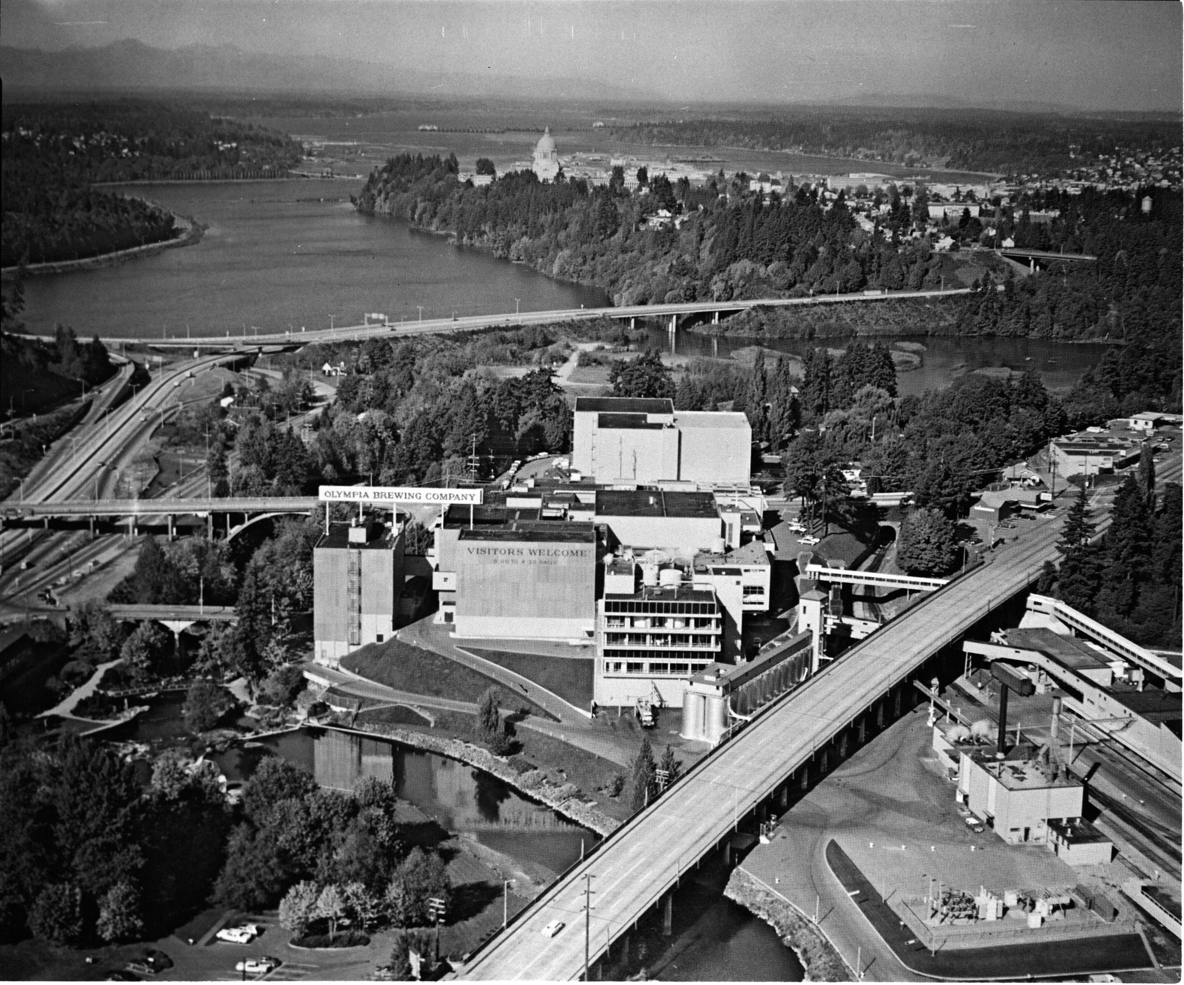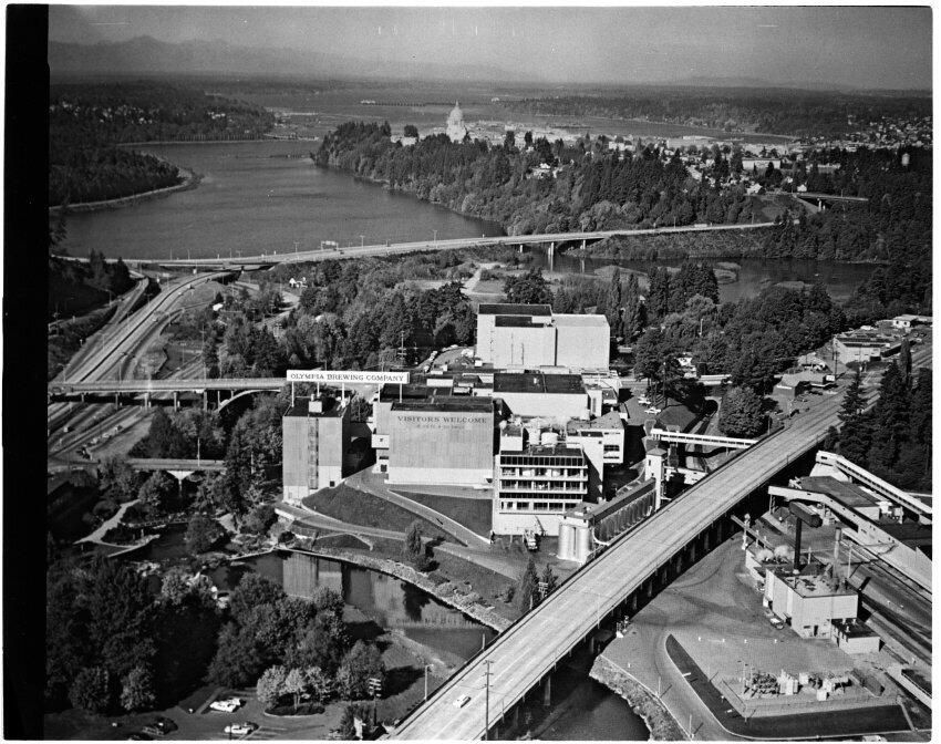 Negative, sheet film. 4 x 5 b&w. Aerial photo looking north. Brewery at center. After 1968, before 1981.