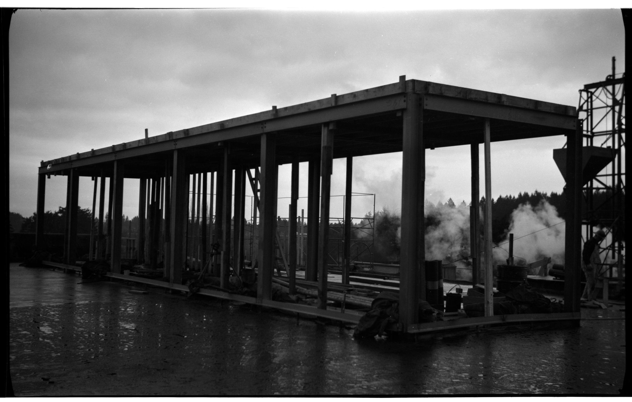 Negative, sheet film. 2 x 3.5 b&w. Building equipment building on roof of M Cellar at Olympia Brewing Company.